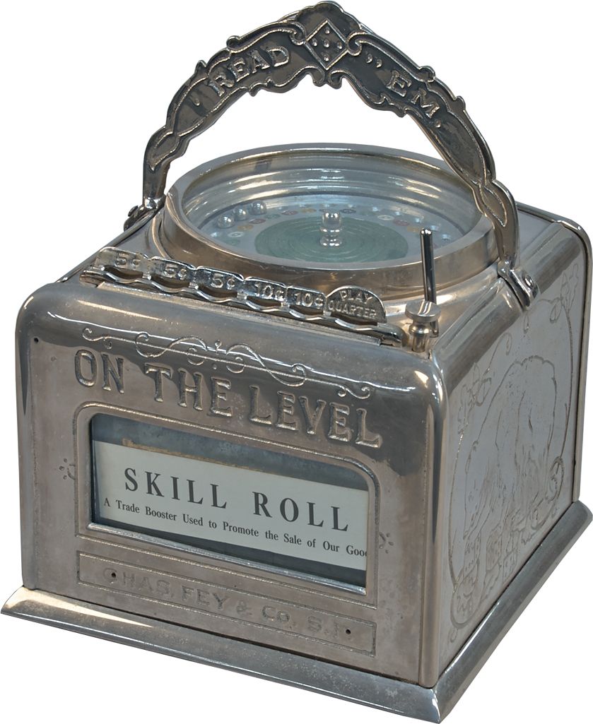 Coin-Op Charles Fey Co. On The Level"The Triple Roll" Roulette Style Skill Trade Stimulator c1914, Cast-iron case, 6 Coin slots: 3-5 cent, 2-10 cent, 1-25 cent, Excellent condition w/ reproduction paper w/ key - 10"w x 9"d x 13"h
