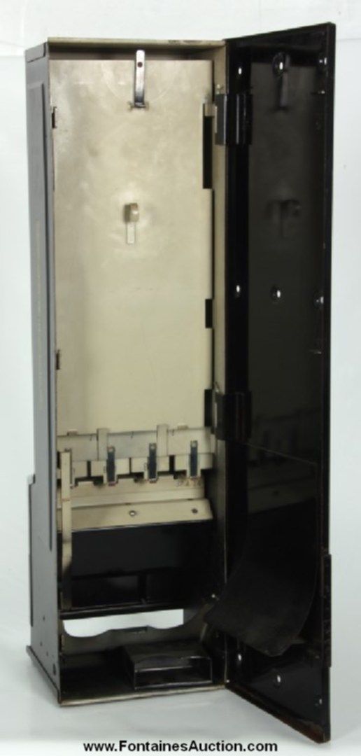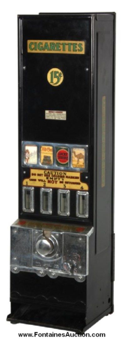 Coin-Op Cigarette Vending Machine. 15 cent coin operated, takes a nickel then a dime, with selector knob indicating 4 selections; black painted case with chromed highlights and decals in very good physical and working condition. 34 in. high x 9.25 in. wide x 8.5 in. deep.