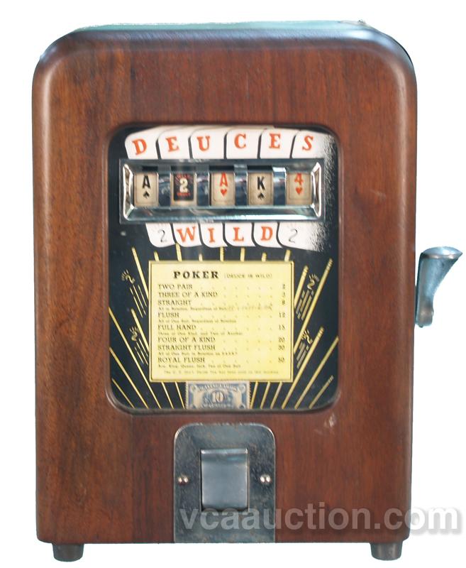 Coin-Op Countertop Wooden Bennet "Wild Deuces" 5-Reel Poker Hand Trade Stimulator, all original w/ keys
