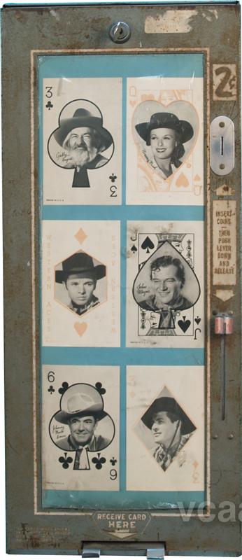 Coin-Op "Cowboy Stars" Countertop Card Vending Machine made by Exhibit Supply Co. w/ additional cards & original key, rare very hard to find
