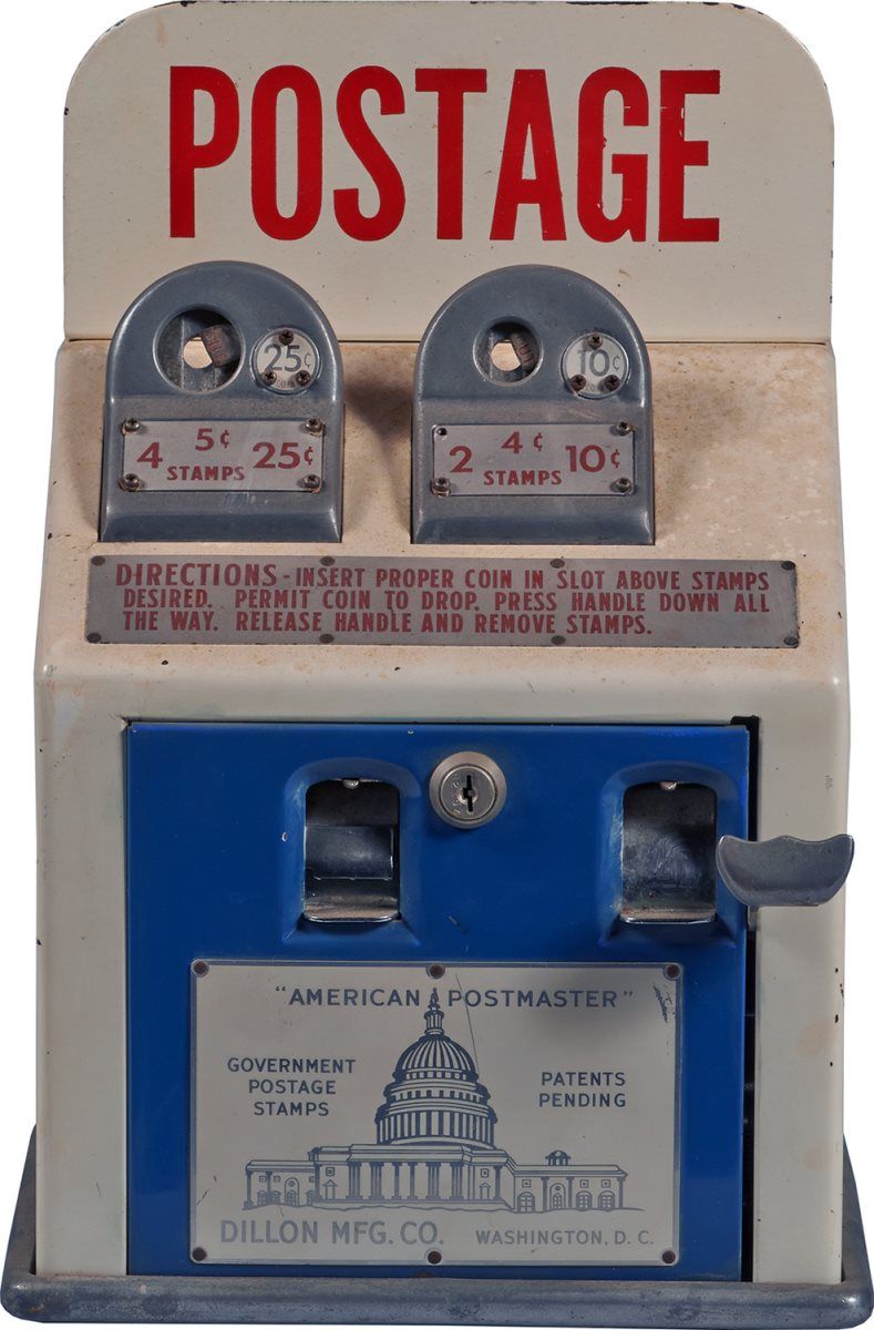 This is a countertop two selection postage stamp vending machine. Circa 1930s. Coin slot has metal flag indicating when the machine is empty. Condition (Excellent). Size 10" x 8-3/4" x 14-1/2"h.