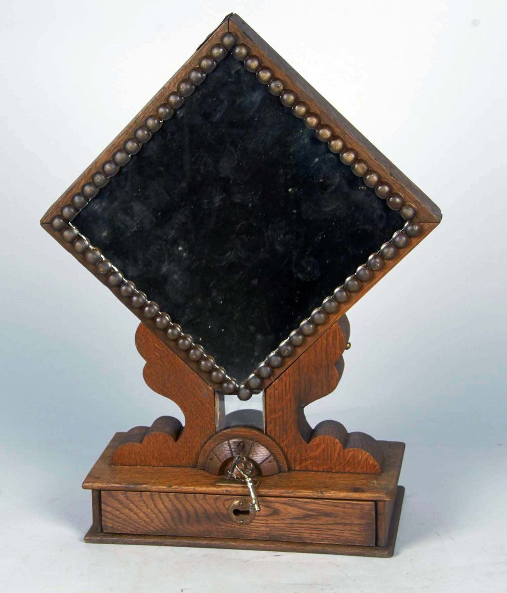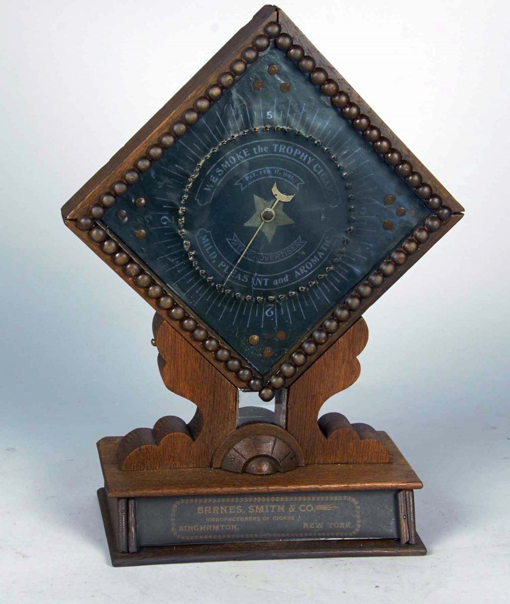 Countertop cigar trade stimulator. Wood display features mirrored back and advertising for Barnes, Smith & Co. Mfg. of Cigars, Pat. 1897. "We smoke the trophy cigar" "mild, pleasant & aromatic", with key. Condition (Very good). Size 19.5" x 14.5" x 6.5"