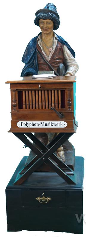 Coin-Op Floor Model "Savoyard" Polyphon Organ Grinder Automaton Figure. Figure of terra cotta in 7 fast colors w/ moving are turning handle while it plays music w/ extra discs - 30" x 22" x 67" tall