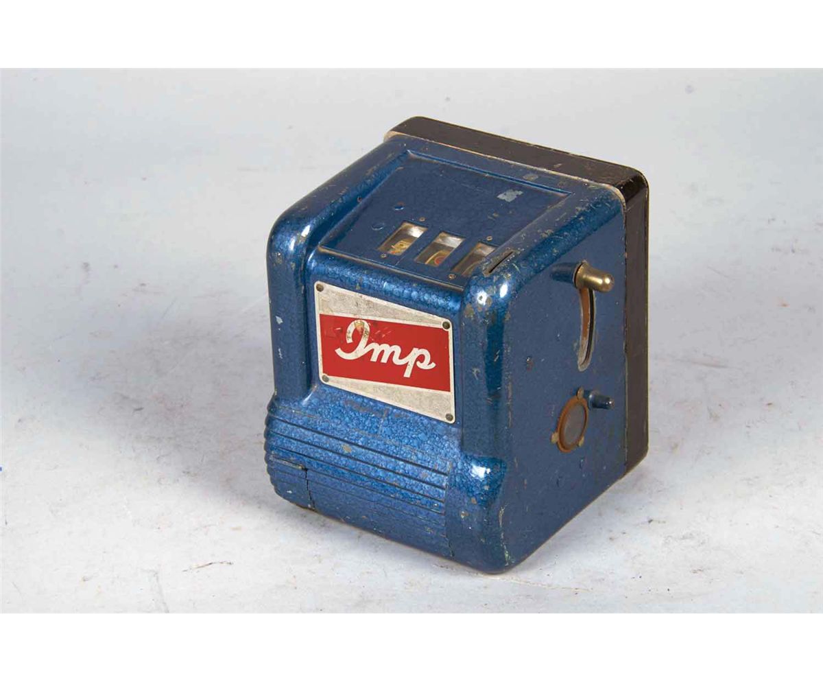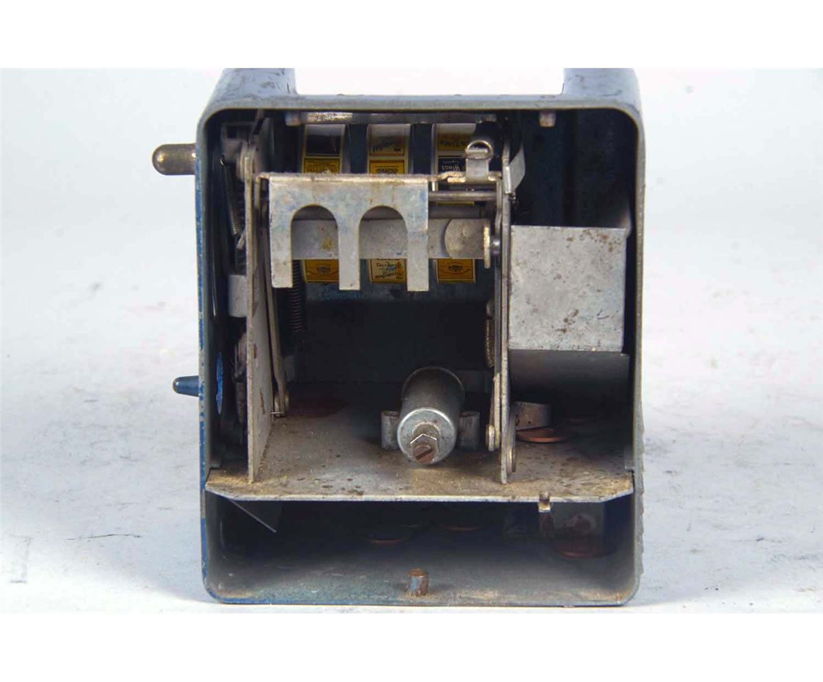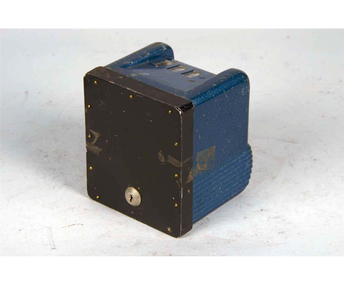 Blue case has cigarette reels and gum ball vendor but no awards card. Circa 1940s. Includes key. Condition (Good). Size 6.25" x 5.5" x 5.5"