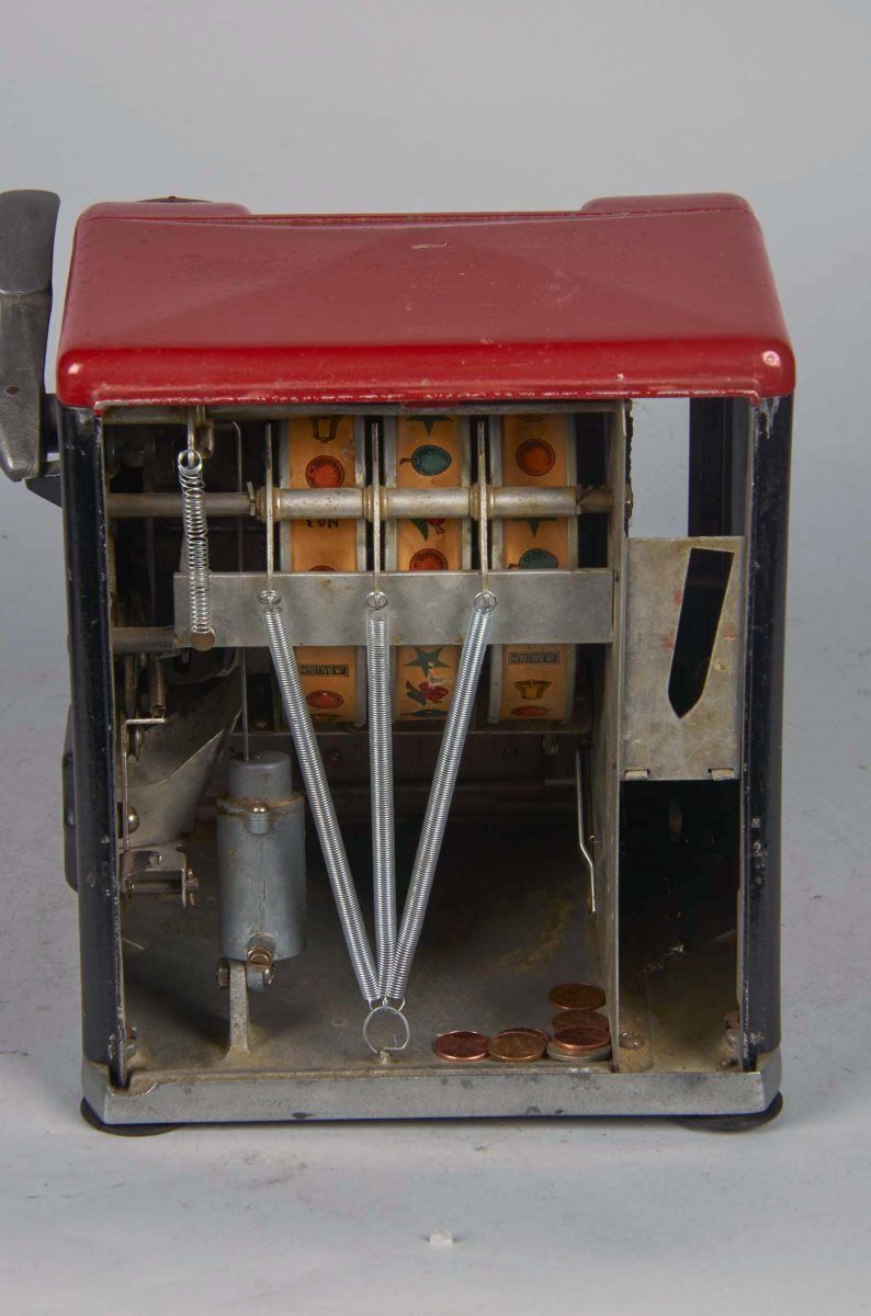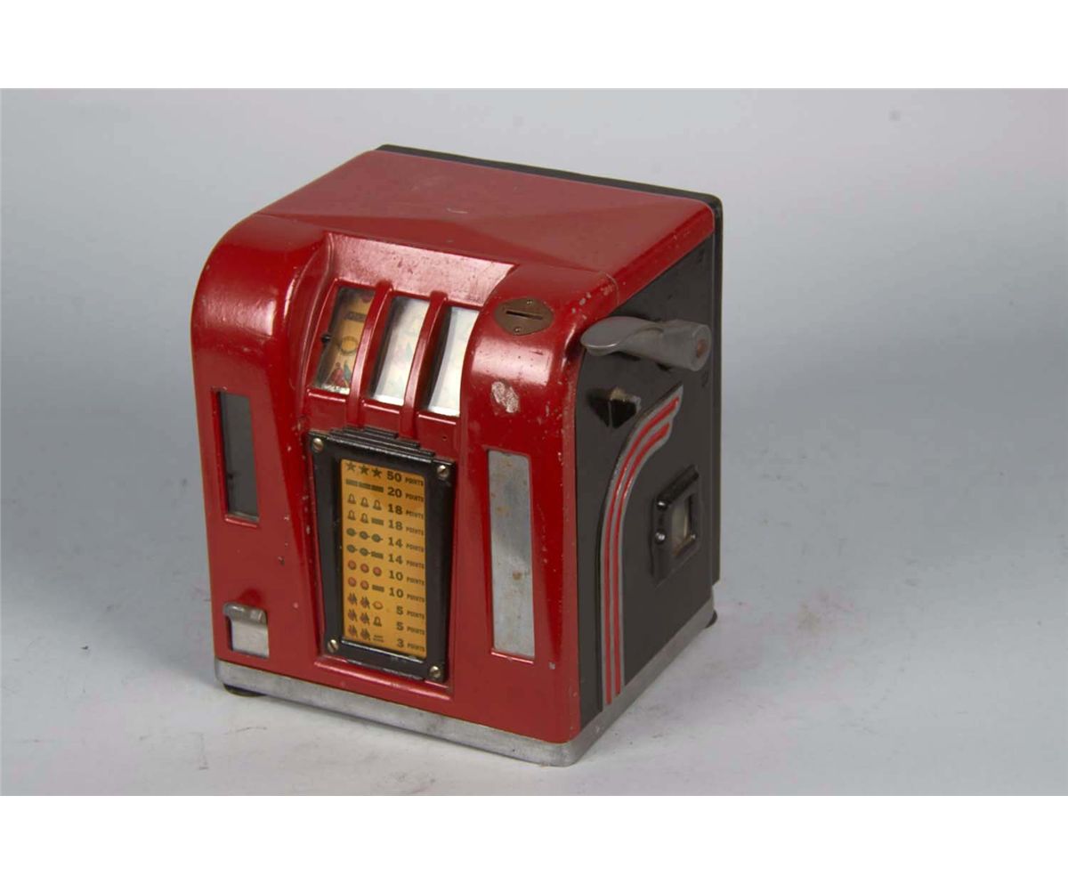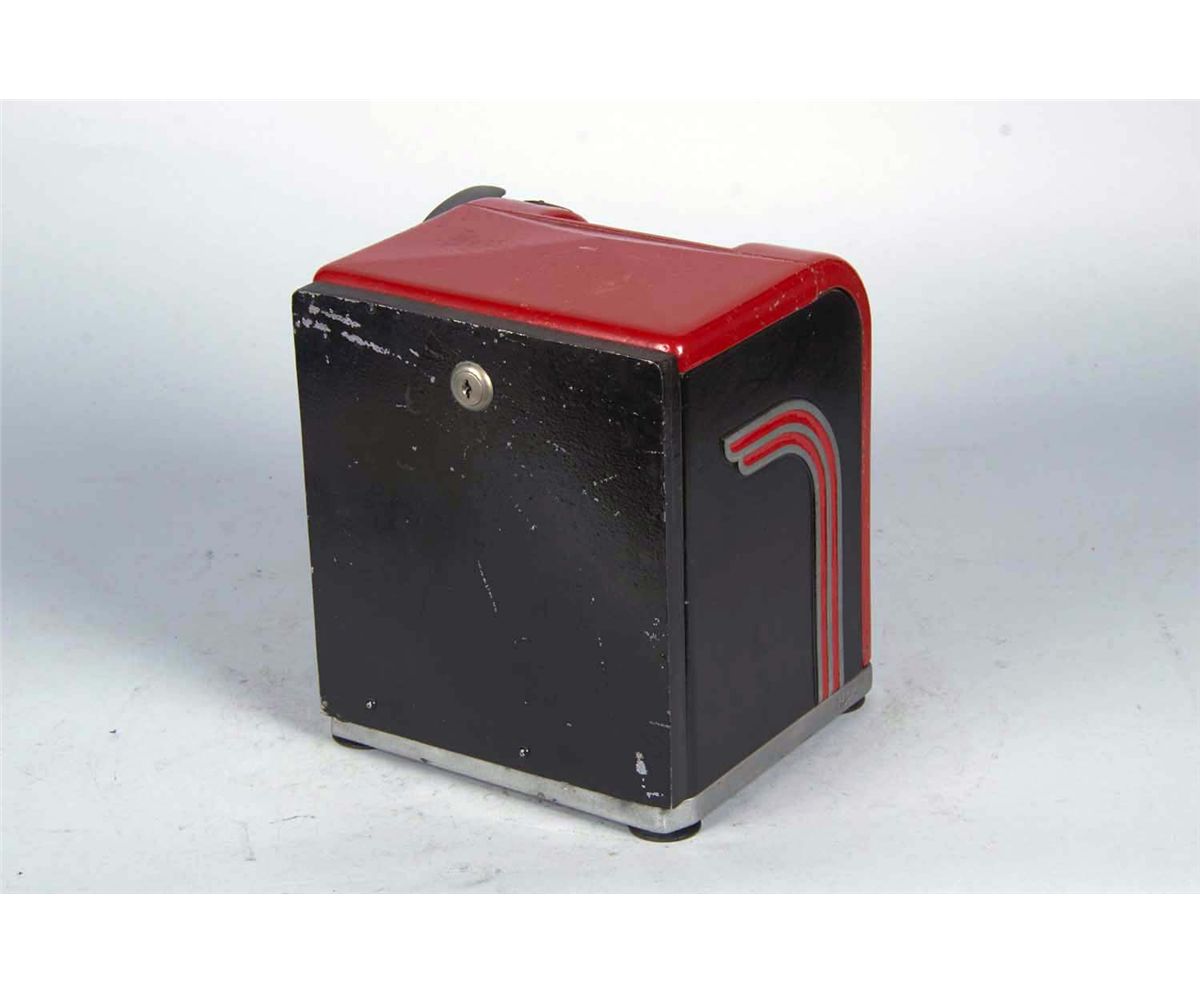 Three-reel red metal countertop cabinet with gum ball vendor circa 1937. Includes key. Condition (Very Good). Size 10" x 8.75" x 8.25"