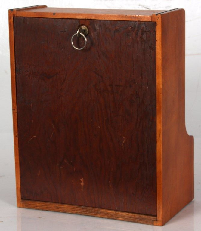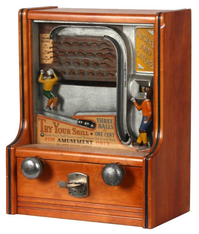 Coin Op Kicker and Catcher Arcade Game. Countertop arcade game has a cherry case, features full cast metal kicker and catcher figures in good paint; by rotating the knob on the right, the kicker kicks a steel ball around the track up into the playing field, falling through the pins and trying to catch the ball with the second figure moving side to side by turning the knob on the left. Has a rotating reel type scoreboard under the painted “Kicker and Catcher” name plate; paper label reads The Baker Novelty Company, Chicago, Illinois, U.S.A. Circa 1935, has a 1 cent coin slot in the front which is missing its spring mechanism, though the machine is in excellent operating condition. Has keys and back board. 17.5 in. high x 14 in. wide x 8 in. deep.