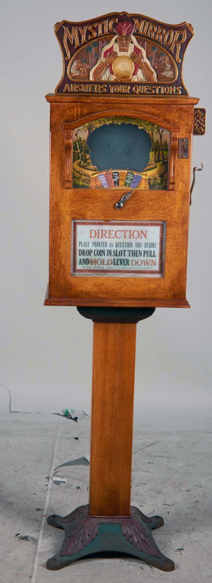 Machine c1926, Manufactured by Mystic Mirror, Mfgers of New York, Marquee top sign features fortune teller, Great Pyramids of Egypt & Sphynx, "Mystic Mirror Answers Your Questions", Front paper restored Condition Excellent Size 19" x 12-1/2" x 72" Include