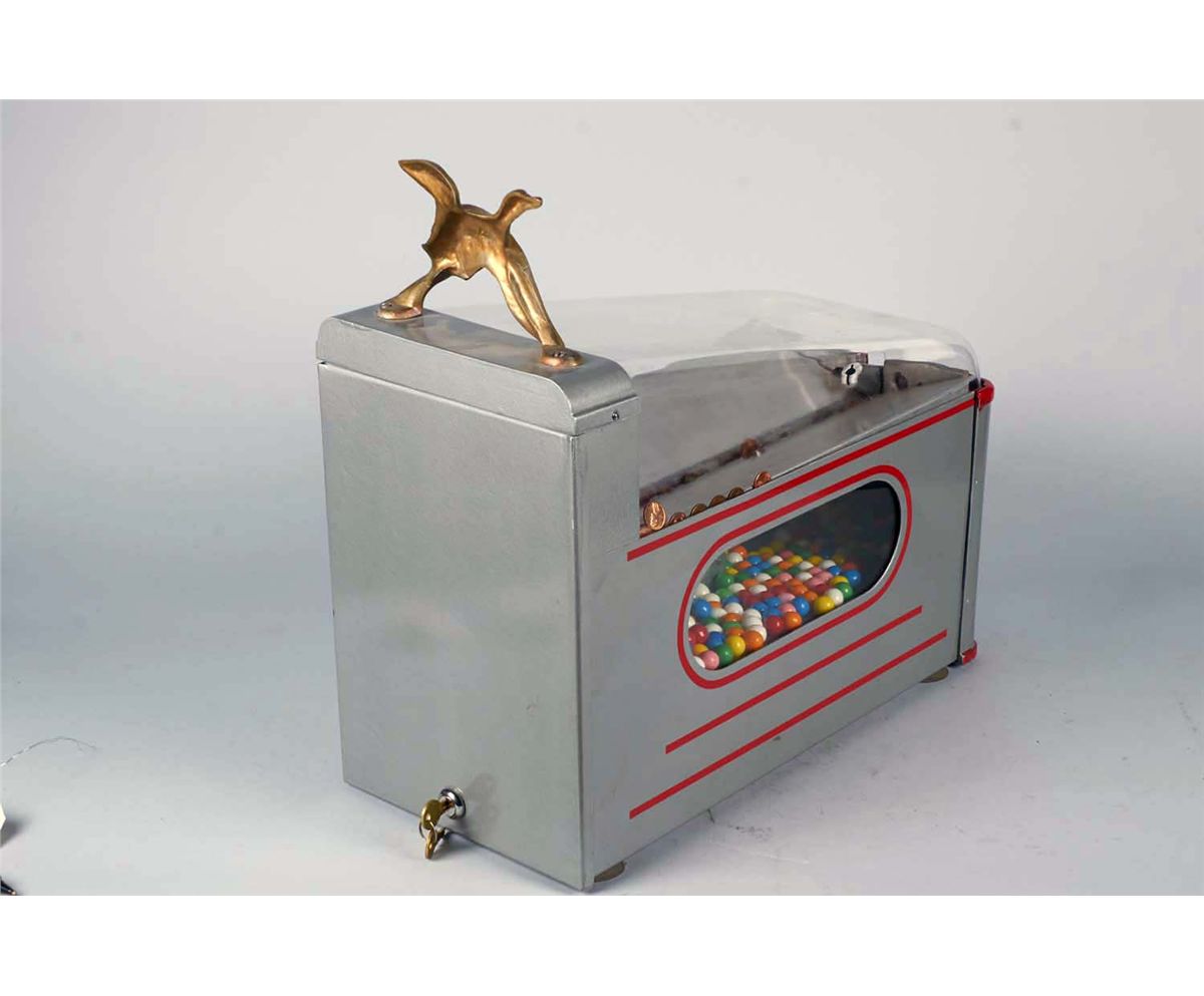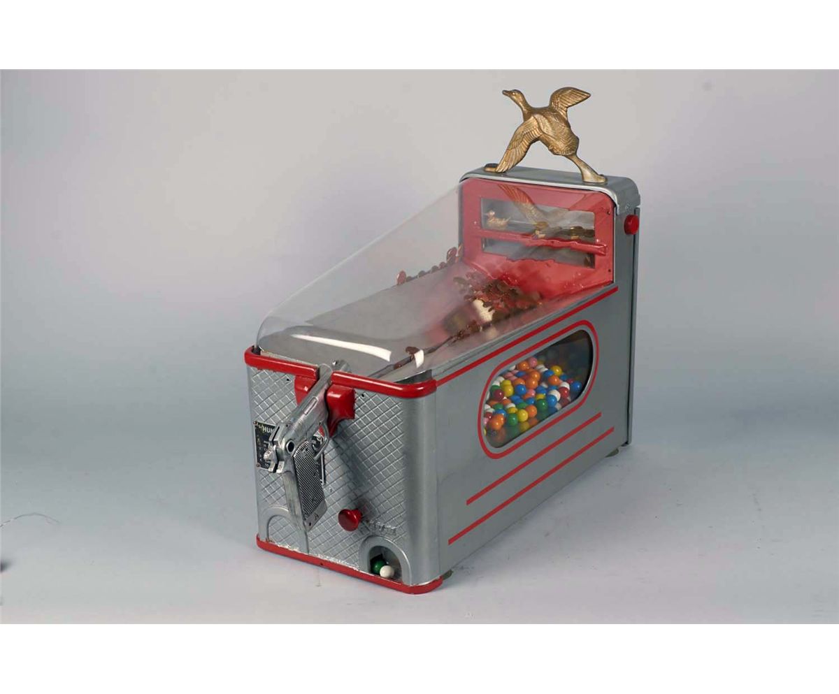 Shooting gallery pistol skill game, aka "Shoot The Duck." Lightweight metal countertop cabinet with lower gum ball vendor. Plastic top globe has rounded edges and includes keys. Condition (Very good). Size 24" x 18.25" x 9.5"
