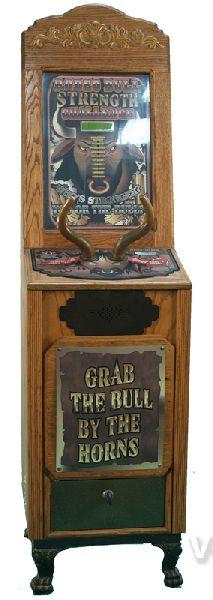 Coin-Op Wooden Floor Model "Rodeo Bull Strength Challenge" Test Your Strength Game "Who's Stronger You Or The Bull?" MFG by Impulse Amusements Sun Valley, CA.