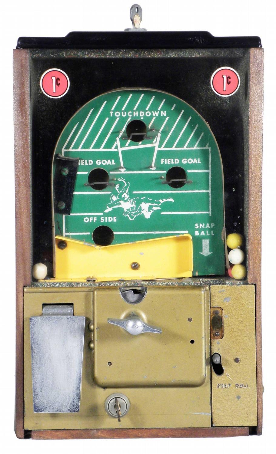 Coin Operated Football Game, one cent. No maker. Good original condition, comes with keys. 8 1/2 X 13 X 8 1/2 inches.