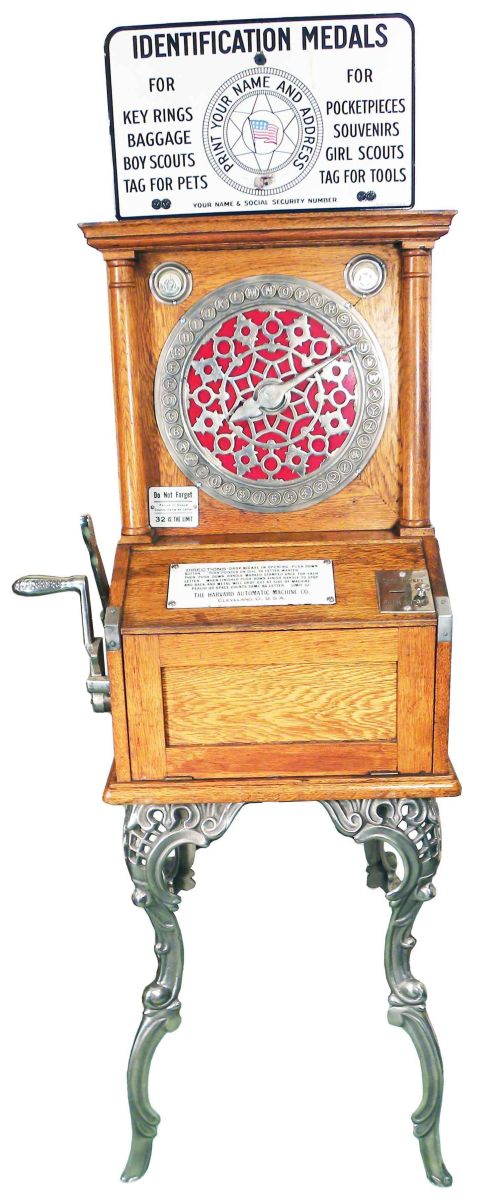 Coin Operated Identification Label Machine. Mfg. by the Harvard Automatic Machine Co., Cleveland, OH. Excellent working condition, comes with key. 20 1/2 X 69 X 20 1/2 inches.