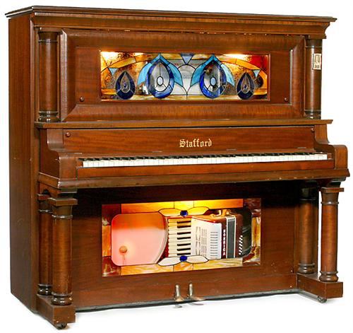 Coin-Operated Nickelodeon Pianola-Orchestrion, c. 1920 By "Brinkerhoff Piano Co., Chicago". Keyboard orchestrion with 8 instruments: automatic piano, mandolin, harmonica, bass drum, snare drum, wood block, triangle, and cymbal. - 110 V. - Case with stained glass front and lamps. - Plays just excellently! - With 2 long-playing rolls with approx. 10 very popular titles/each. - A really spectacular collector's item and exhibition piece with magnificent entertainment value!<Br>