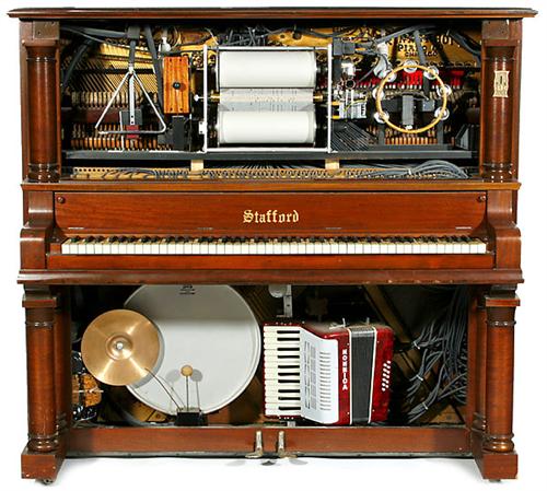"Nickelodeon Pianola-Orchestrion", um 1920 Ein automatisch spielendes Musikinstrument der Extraklasse von "Brinkerhoff Piano Co., Chicago"! Pianola erweitert mit zahlreichen Instrumenten zu einem voll funktionsfähigen "Orchestrion", das eine beeindruckende Instrumentierung bietet: automatisches Klavier, Mandoline, Ziehharmonika, große Trommel, Becken, Rassel, Holzblock und Triangel. - Mit Notenrollen gesteuerte Beleuchtung, auf Münz- oder Dauerbetrieb einstellbar. 110 Volt, Temporegulierung. Gehäuse mit bleiverglaster Front und Verzierungen. Maße: 143 x 74 x 140 cm. - Exzellent und ausdrucksstark spielender Zustand! - Mit 2 Langspiel-Notenrollen mit jeweils 10 populären Titeln! - Ein spektakuläres Sammlungs- und Ausstellungsstück mit grandiosem Unterhaltungswert.