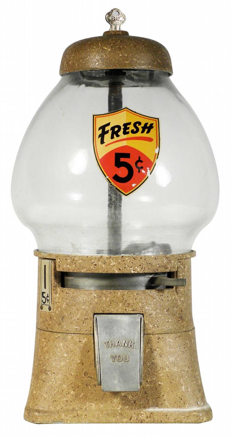 Coin Operated Peanut Vending Machine, 5 Cent. Aluminum and glass. Very good original condition, comes with key. 6 1/2 X 14 X 7 1/2 inches.