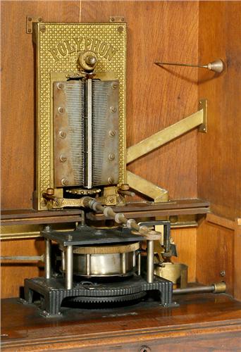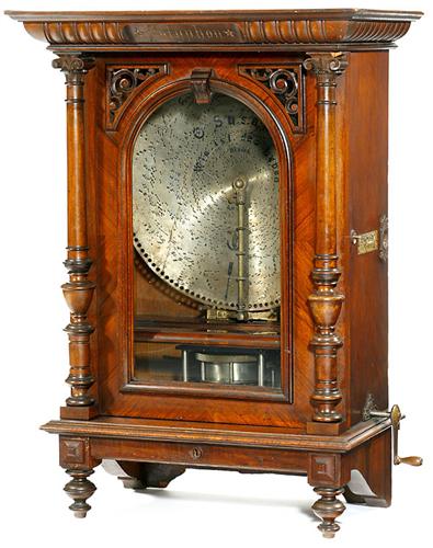 Polyphon Nr. 104 "Polyphon Musikwerke, Leipzig", Plattenspielwerk für 50-cm-Blechplatten, 118 Töne im Doppelkamm (komplett!), Nußbaumgehäuse, Münzeinwurf 5 Pf., Feder defekt, spielt nur bei gleichzeitigem Drehen der Kurbel. - Sehr guter unrestaurierter Originalzustand!