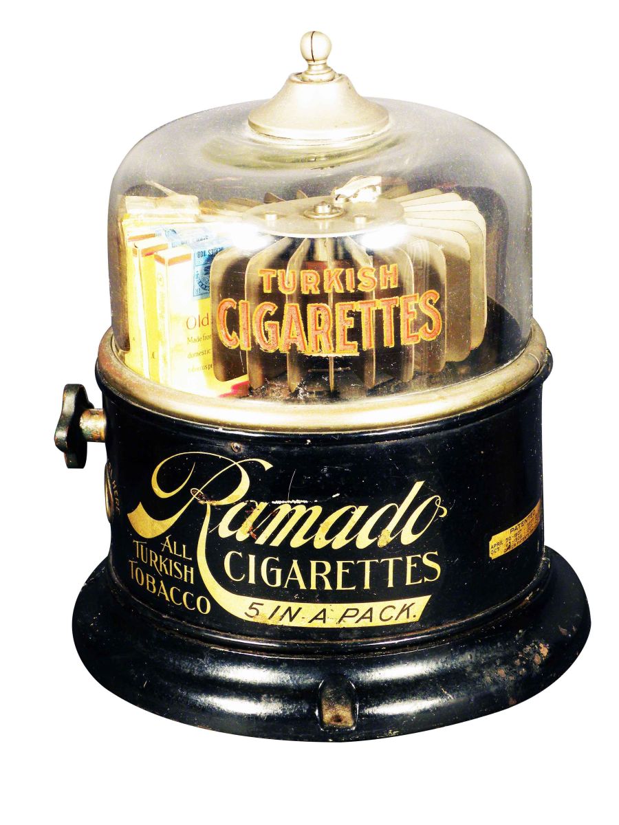 Rare Coin Operated Ramado Cigarettes Dispenser. Excellent original working condition. 9 1/2 X 12 X 9 1/2 inches.