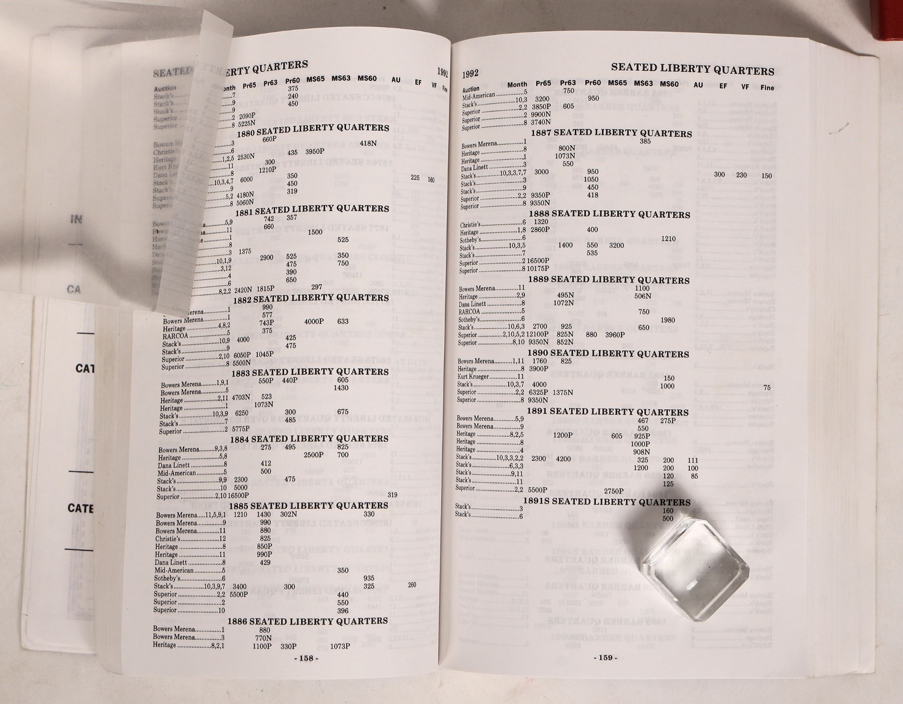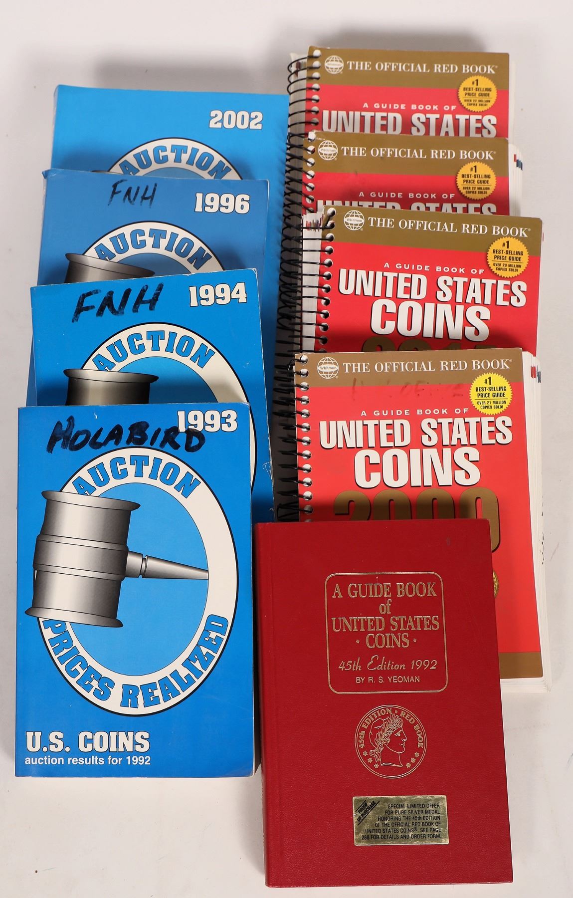 Auction Prices Realized, (4) 1993, 1994, 1996 and 2002 editions, compiled and edited by Bob Wilhite and Tom Michael, 300-470 pages, paperback; "A Guide Book of United States Coins," (4) 2009, 2010, 2011, 2014 editions, by R.S. Yeoman, 400+ pages each, paperback; and "A Guide Book of United States Coins," 45th ed. c1992, by R.S. Yeoman, 286 pp. hardback. Please see photo(s) for more details.