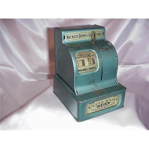 Uncle Sam's 3 coin registered bank. Durable Toy and Novelty Company. Inc. (Holds $50.00) Green. Condtion is fair to good, there is some slight rust and the paint has become dull. bank works.