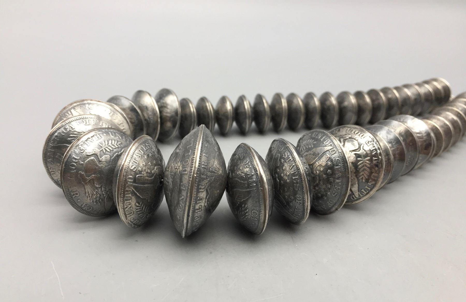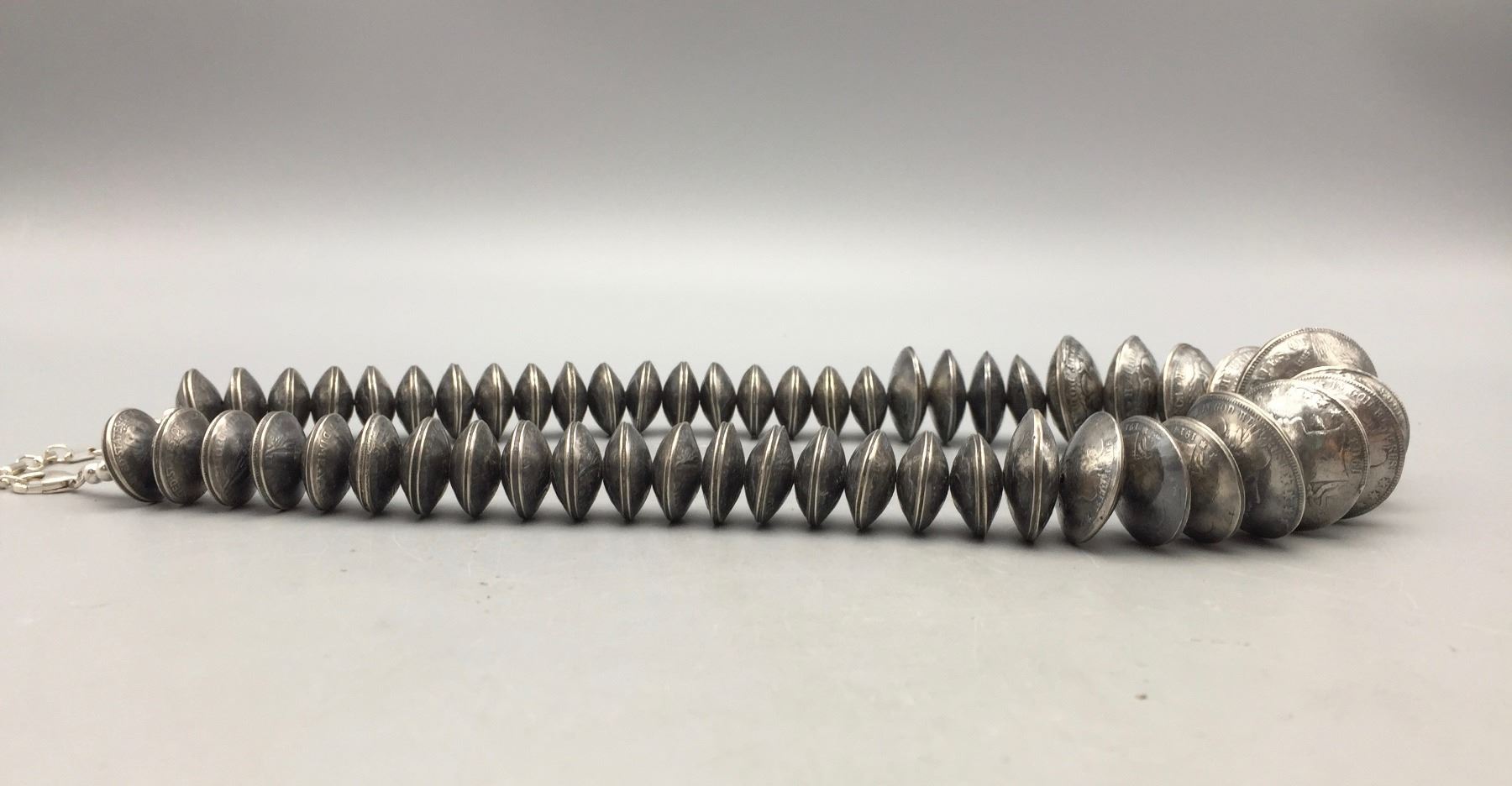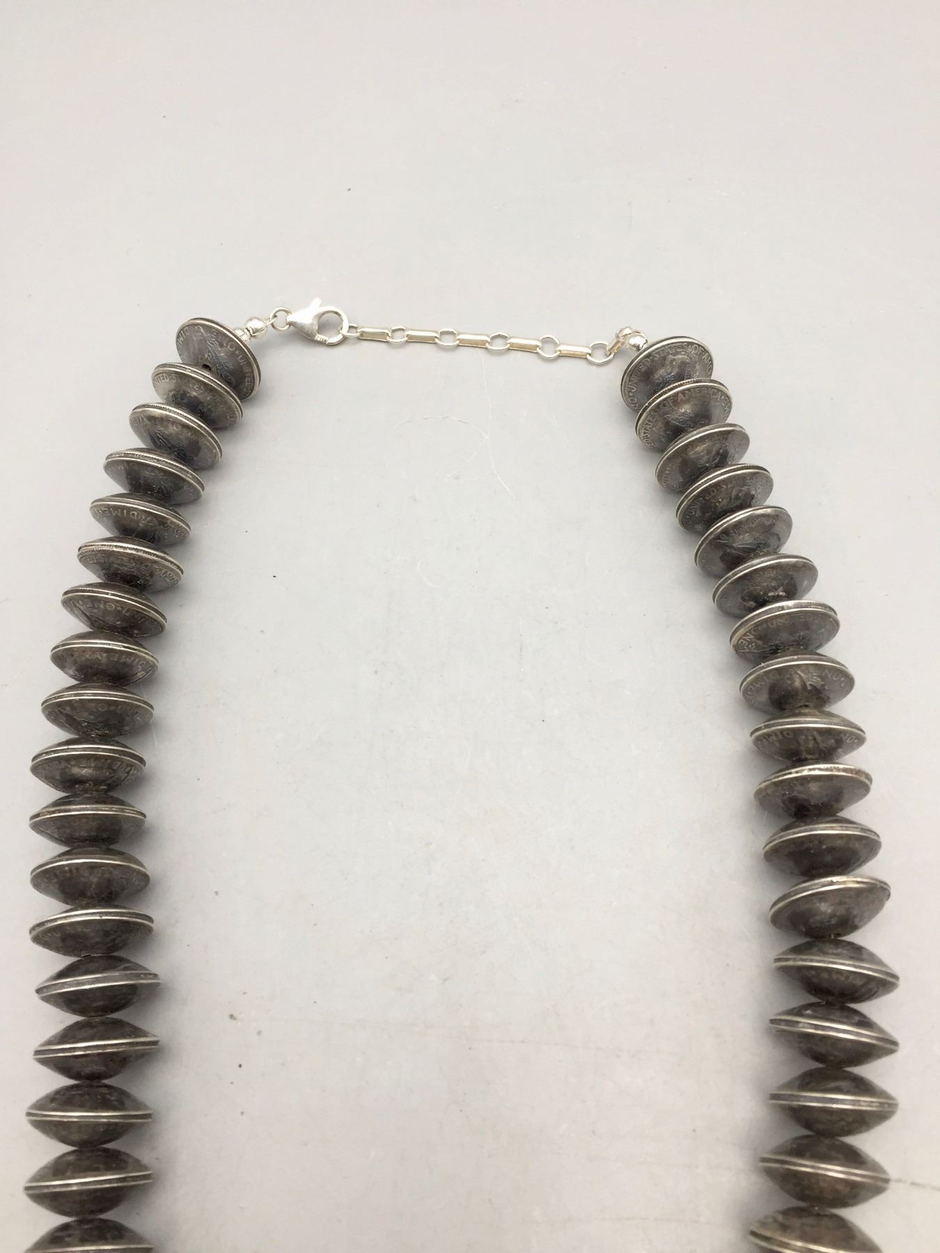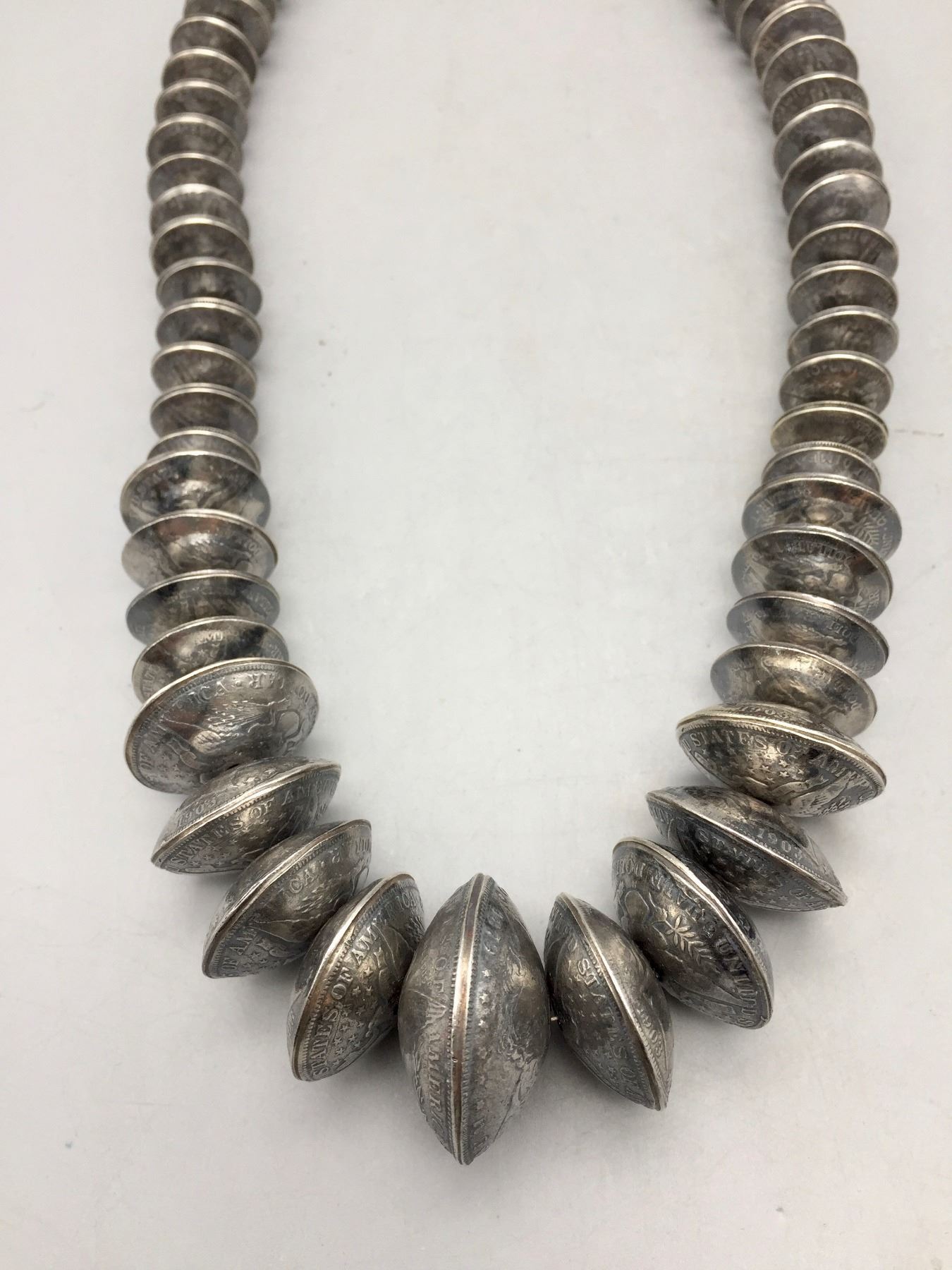 Description: For sale in this lot is a unique and hefty, coin silver bead necklace. The disk shaped beads start with dimes, then go to nickels, quarters and finally graduate to a half-dollar size bead for the pendant. Maker: No hallmark. Approx. Age: Fairly modern. Size: Fits a 20” neck. Weighs a whopping 338 grams. Condition: Good for its age, normal wear expected. Please look closely at the pictures - they are an important part of our description. Shipping: There will be a $5 handling / packaging fee for shipping this lot. The actual cost of postage will be added on top of that.