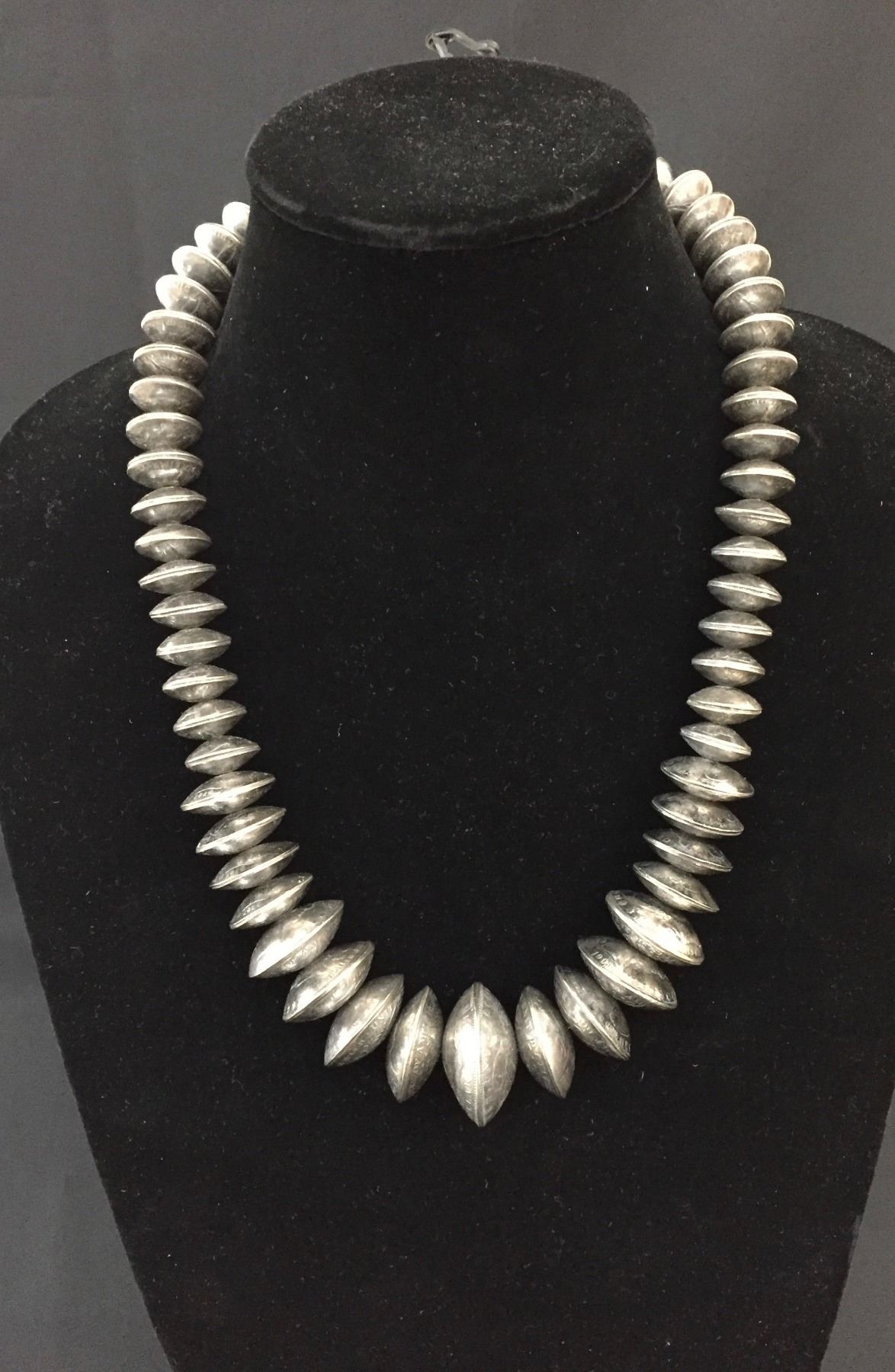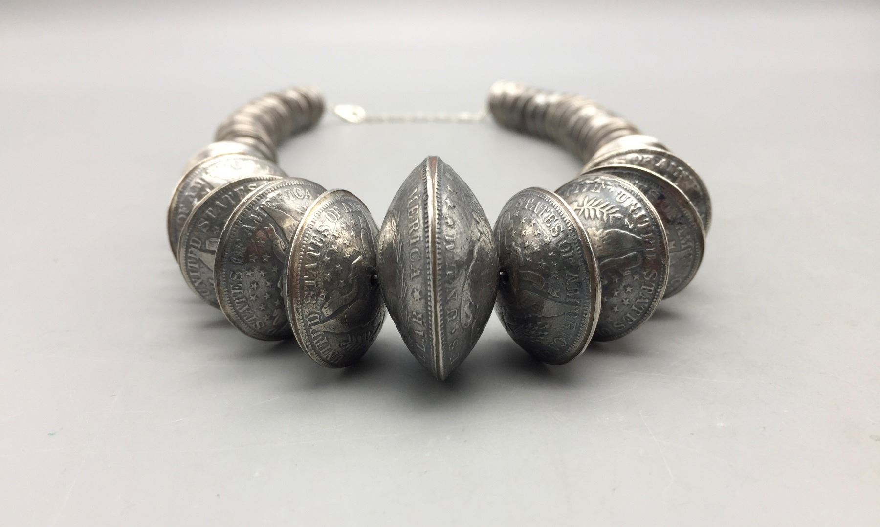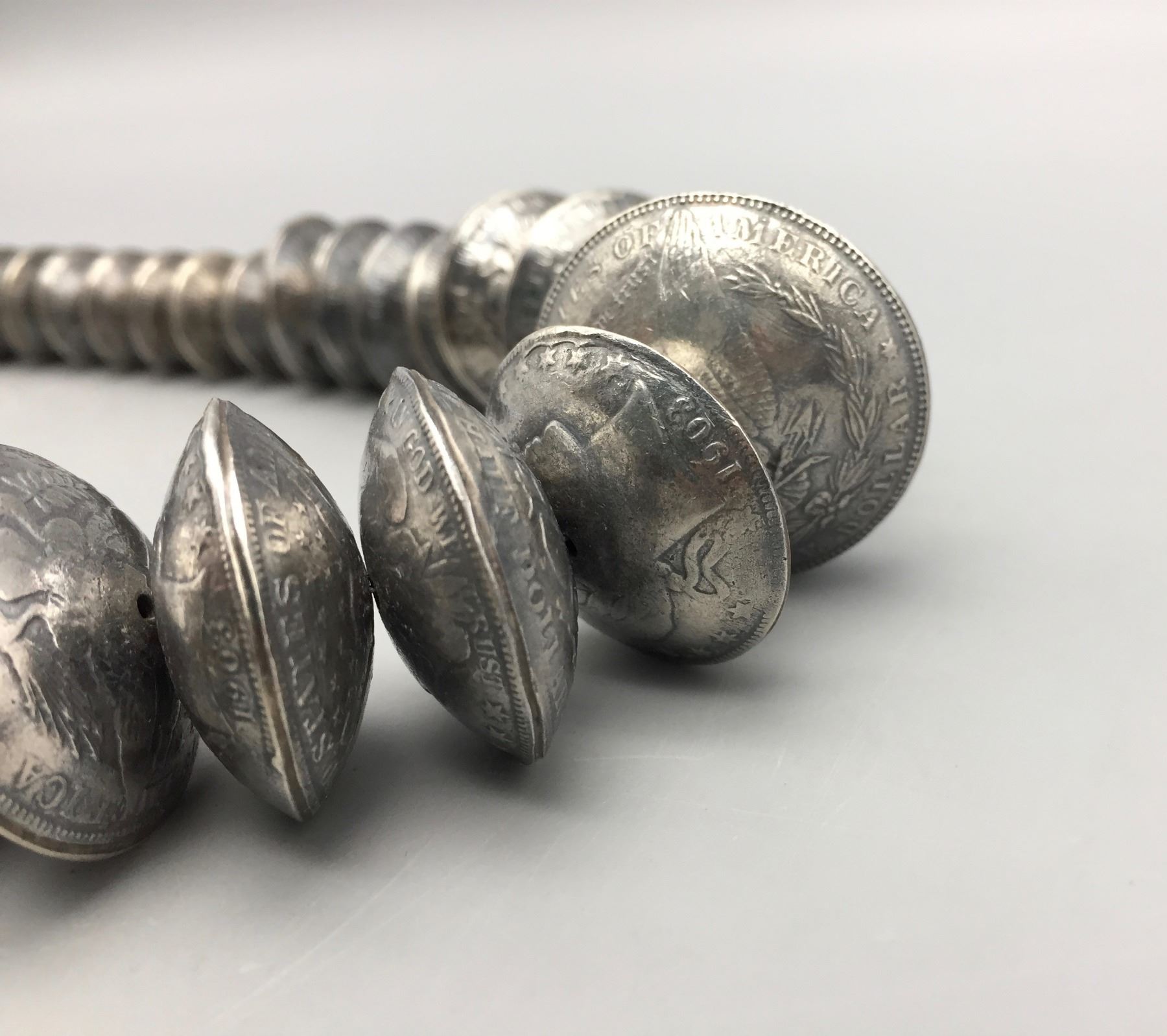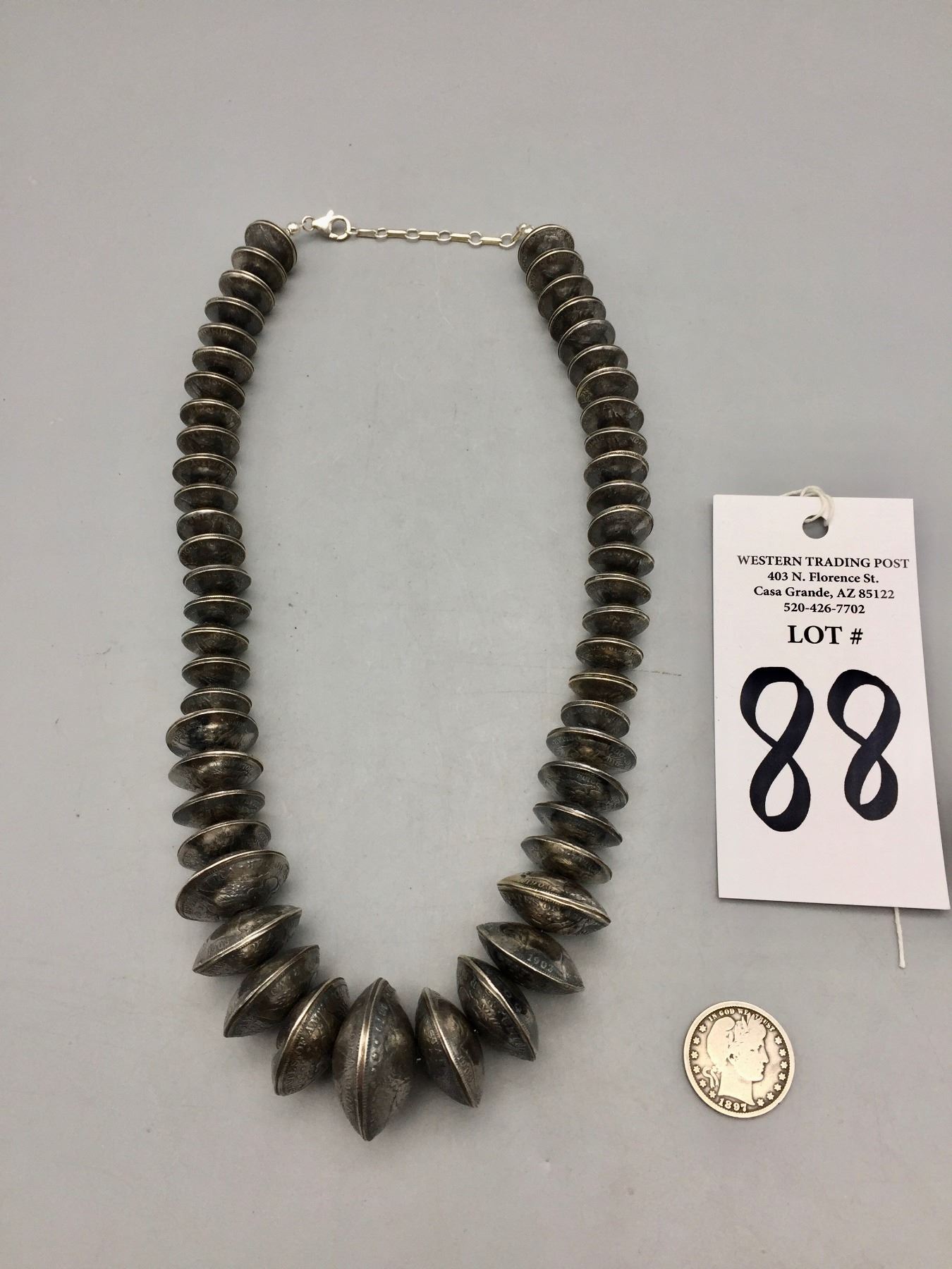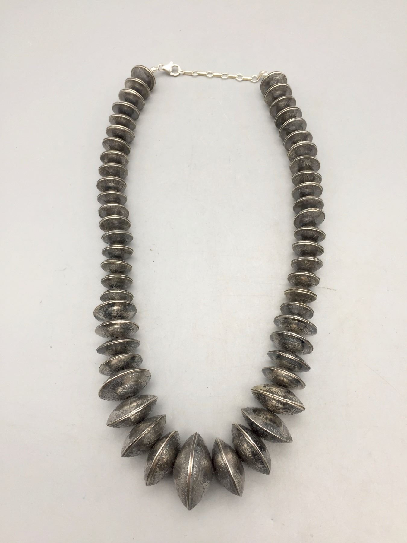 Description: For sale in this lot is a unique and hefty, coin silver bead necklace. The disk shaped beads start with dimes, then go to nickels, quarters and finally graduate to a half-dollar size bead for the pendant. Maker: No hallmark. Approx. Age: Fairly modern. Size: Fits a 20” neck. Weighs a whopping 338 grams. Condition: Good for its age, normal wear expected. Please look closely at the pictures - they are an important part of our description. Shipping: There will be a $5 handling / packaging fee for shipping this lot. The actual cost of postage will be added on top of that.