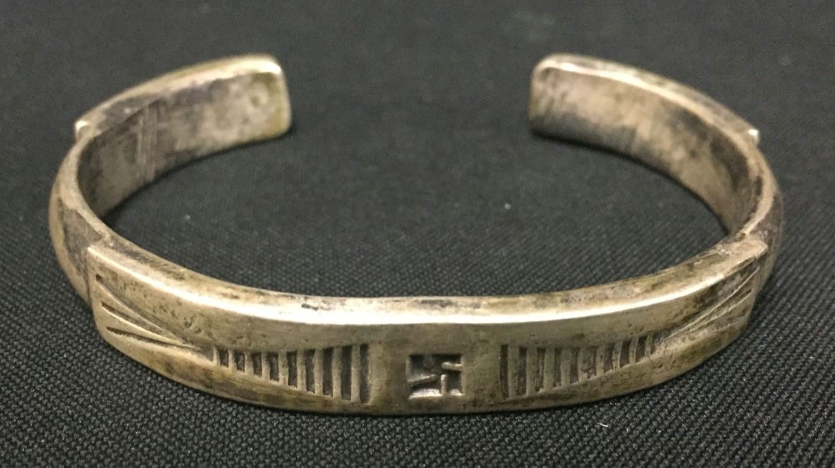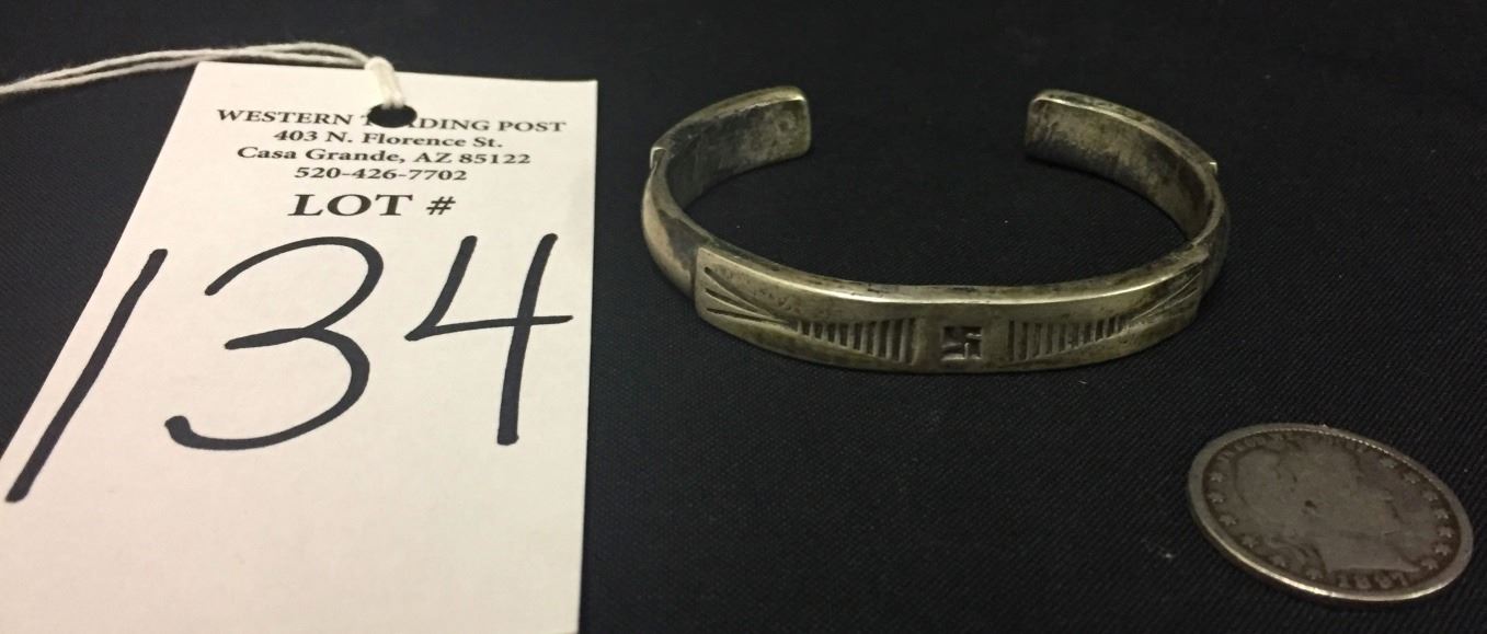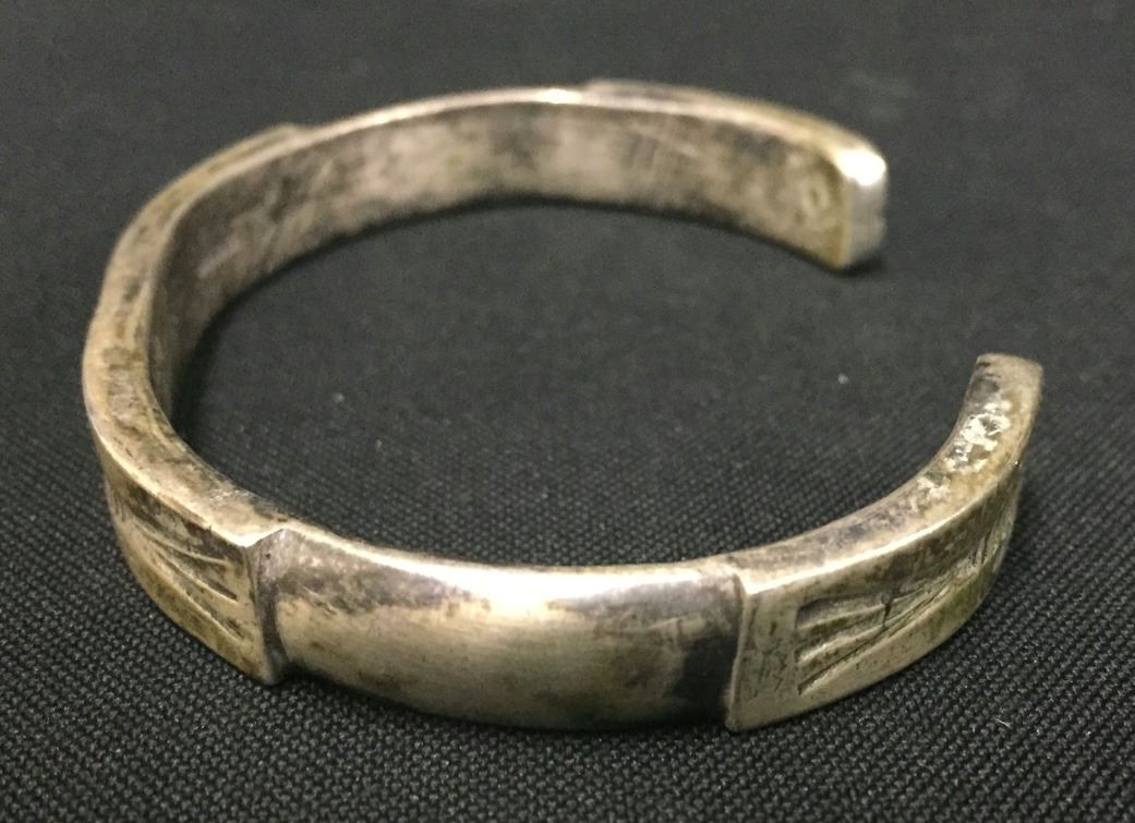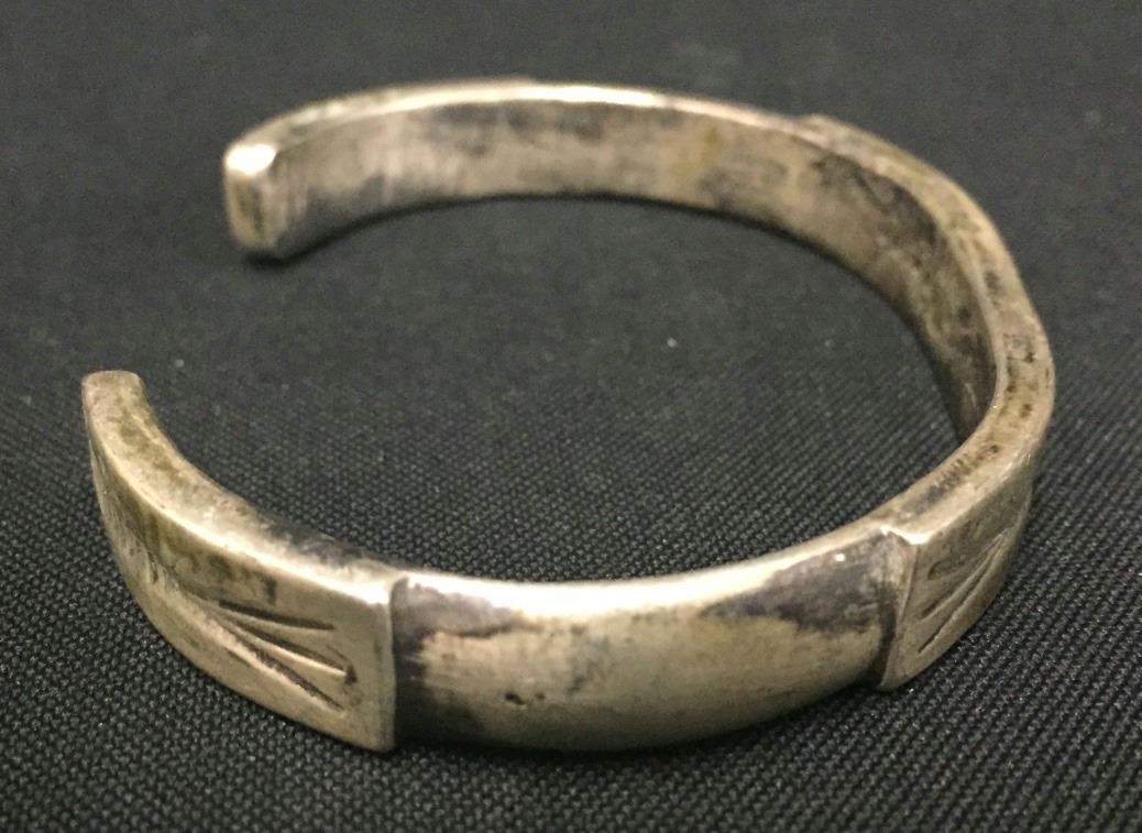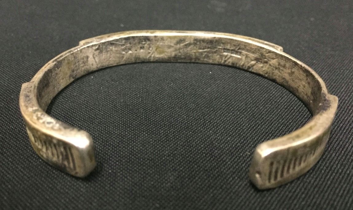 Maker: Red Rabbit Trading Co., Tucson, AZ. Approx. Age: Contemporary. Size: Measures 5.5” inside, plus there is a 1” opening. It weighs 42.6g. Condition: Good. Additional Info: Retro-style, coin silver ingot bracelet. Completely handmade! Please look closely at the pictures - they are an important part of our description. Shipping: There will be a $5 handling / packaging fee for shipping this lot. The actual cost of postage will be added on top of that.