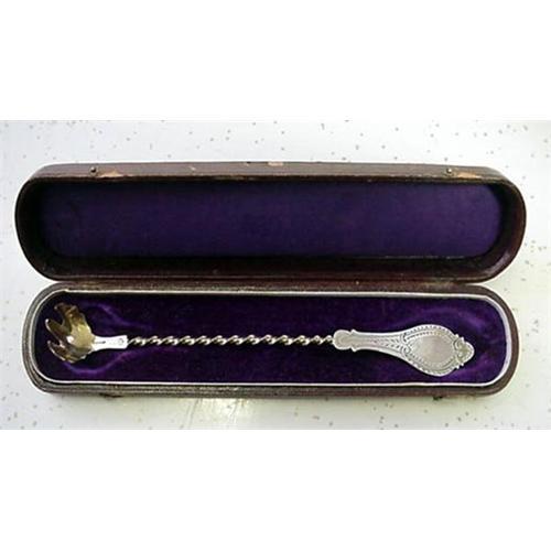This rare olive ladle has a twist handle, a gold washed bowl, and engraved. the Back monogram is J. W. .