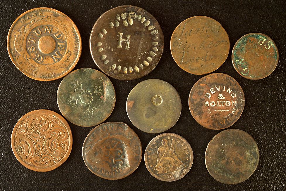 Interesting lot of coins and tokens that have been counterstamped, punched and engraved: Bank of Montreal, Penny, 1842, with counterstamp "G. Stunden", punched on obverse; impressed on reverse; Fine; George III Half Penny, "Devin's & Bolton, Montreal", small ampersand, VG; Bank of Upper Canada, Half Penny, 1854, with "JJ" punched in a serated square, Good; U.S. Two Cents, with "GW" punched on obverse; "US" and "GW" on reverse; "US" supposedly refers to United States and "GW" for George Washington, but are probably fantasies; British Penny, 1797, with "CUPAR" one side; "H" in ring on other; George III Half Penny, engraved, "James Parker, Leeds"; U.S. Seated Quarter, ornate "G" on reverse; Russia copper 2 Kopek, 1814, with ornate filigree design on reverse; Three 18th Century GB Half Pennies with various stamps or punches; Total of 11 interesting pieces.