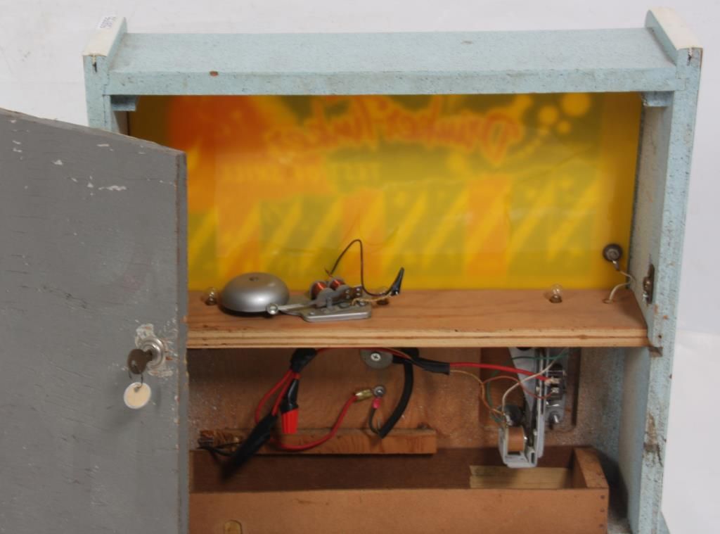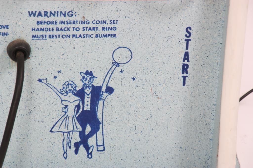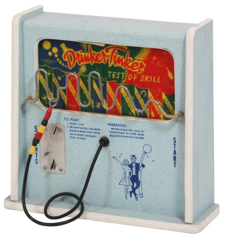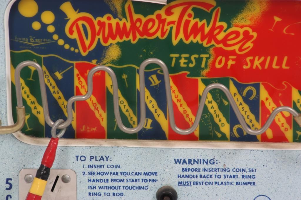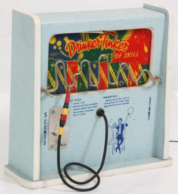 Coin-op Drinker-Tinker Arcade Game. Counter top 5 cent coin operated game, has a wavy metal bar across the front with a small handle having a loop at the end, the idea of the game is to try and move the loop from one end of the rod to the other without touching the edges of the rod, there is a plastic light-up display inset behind, gauging various levels of sobriety from right to left. In good working condition. 20 in. high x 21 in. wide x 7 in. deep.