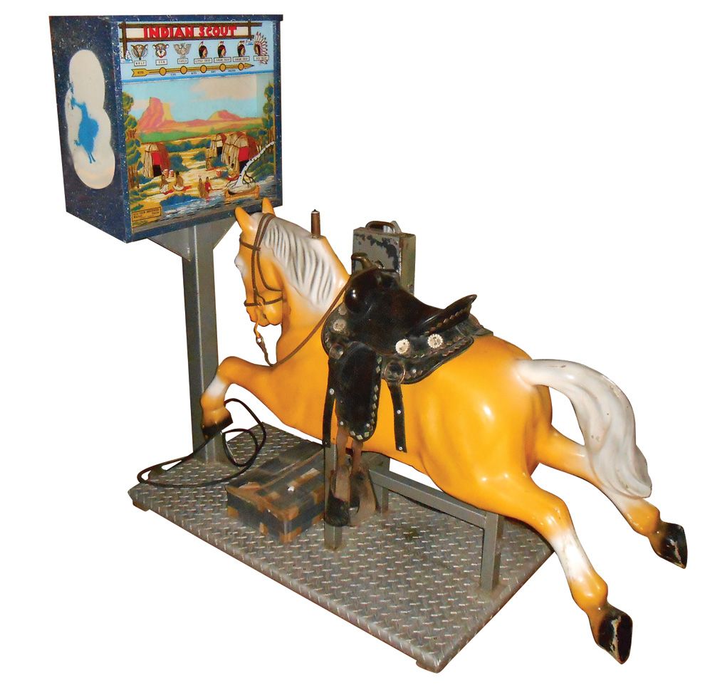 Coin-operated Indian Scout target game, mfgd by All-Tech Industries-Hialeah, FL, 25 Cent play, needs minor adjustment to work, o/wise VG cond w/orig All-Tech pistol, 63"H x 28"W x 7'L.