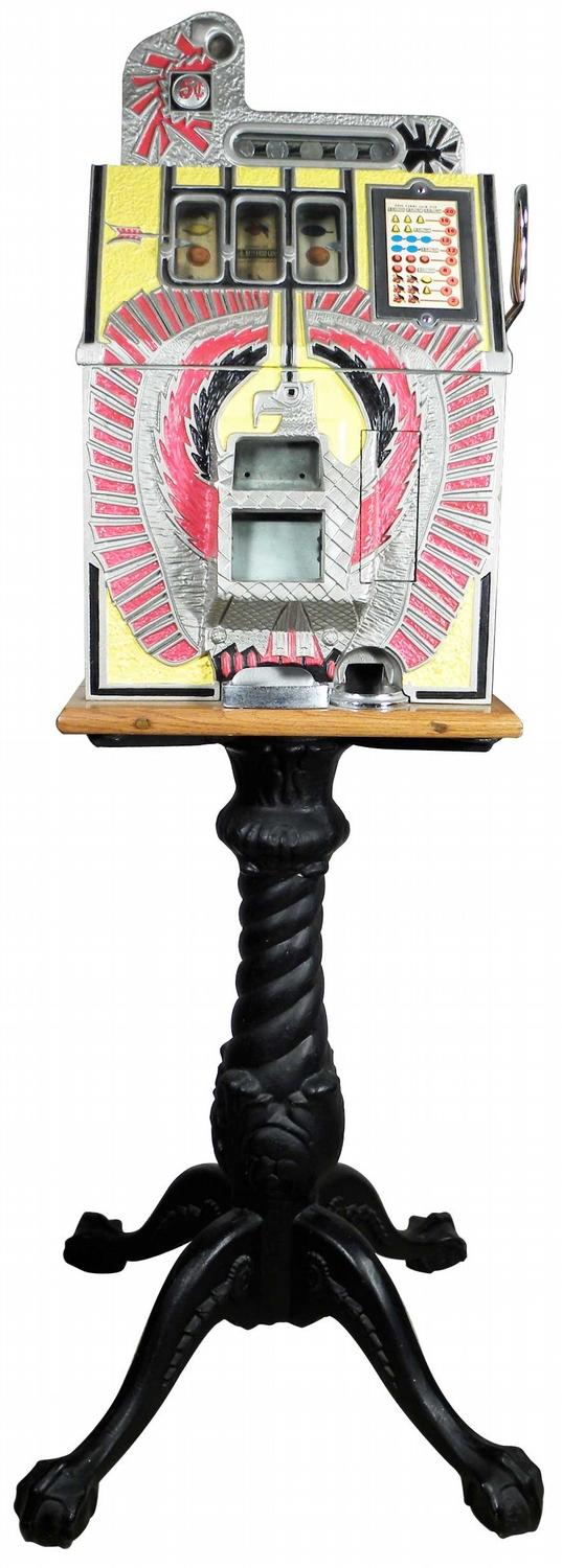 Coin-operated War Eagle 5 Cent, three reel slot machine. Mills Novelty Company. Excellent all original condition. Comes with cast iron stand and key.