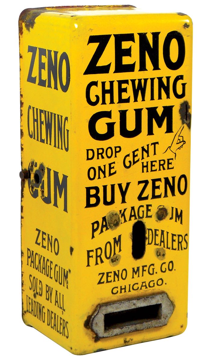 Coin-operated Zeno Chewing Gum machine, yellow porcelain, 1 Cent, Good cond w/overall spots of porcelain loss, 16.5"H x 7"W x 5.5"D.
