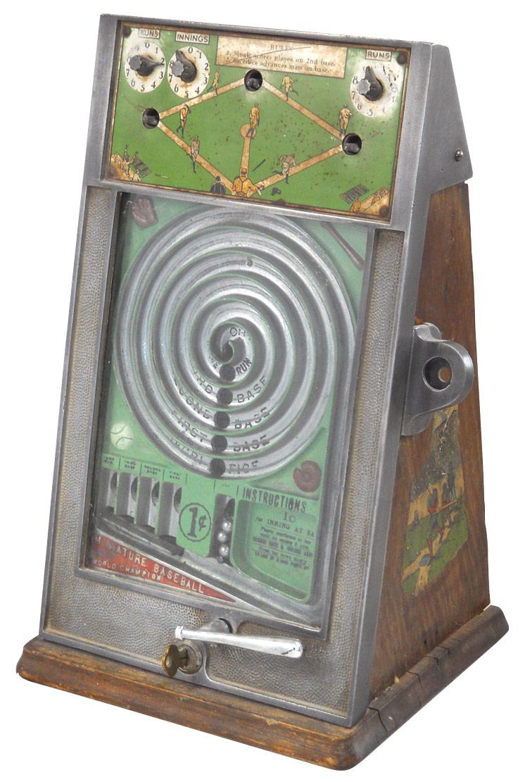 Coin-operated baseball skill game, PEO Miniature World Champion, 1 Cent, VG orig working cond, 17"H x 8"W.