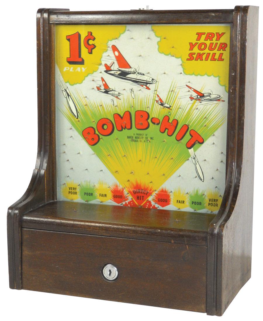 Coin-operated coin drop, Bomb-Hit Anti-Axis, 1 Cent, nice graphics, VG orig cond, 15"H x 7"W x 12"D.