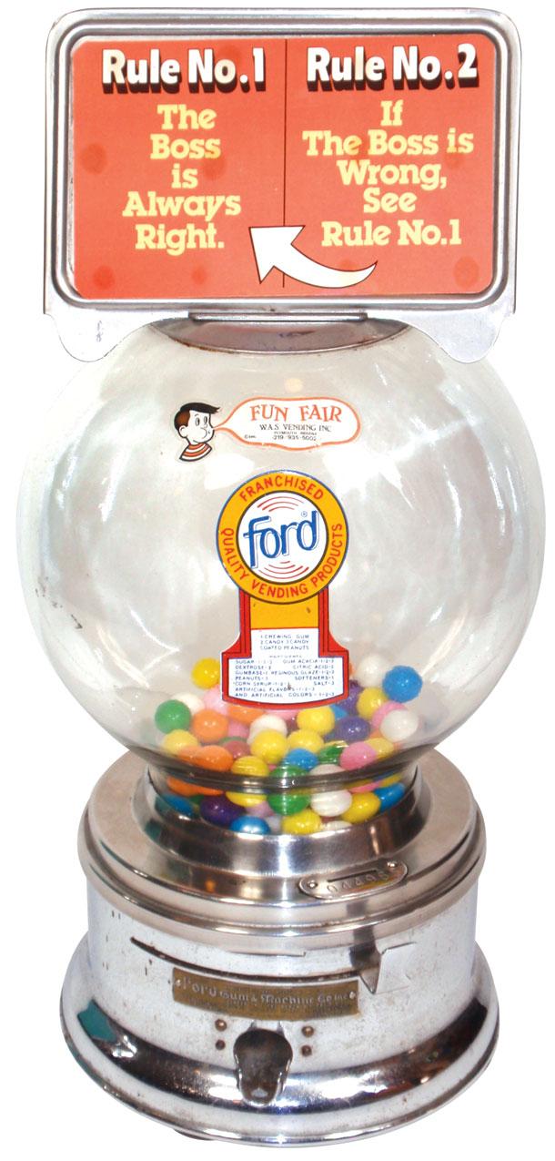 Coin-operated gumball vendor, Ford w/marquee, chrome, Exc cond, 17"H.