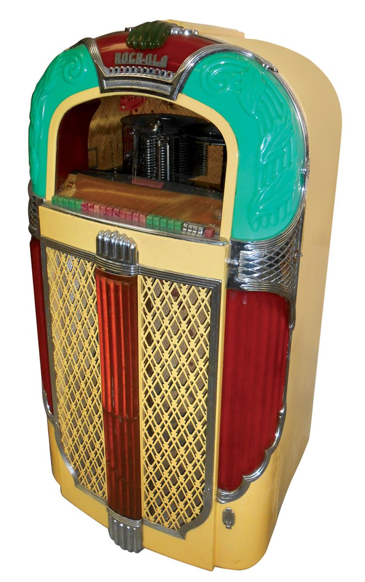 Coin-operated juke box, Rockola, Model 1428 "Magic Glo", c.1949, 78 rpm w/20 selections, painted blonde finish, needs volume tube & missing interior plastic that goes over selection strips, VG cond w/good plastics & full of 1953-1954 records, 62"H x 31"W.