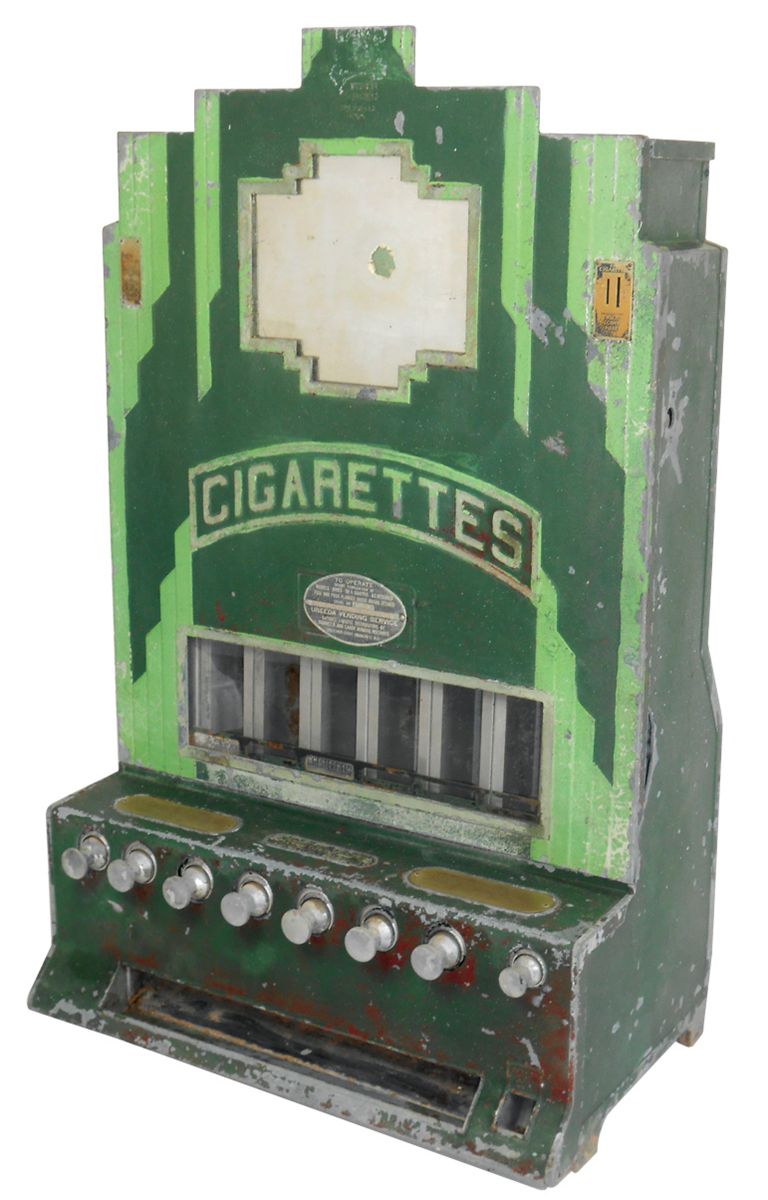 Coin-operated machine, Art Deco cigarette vendor, mfgd by Rowe & distributed by Uneeda Vending Service-Brooklyn, NY, 8 column cast aluminum w/orig paint, 1" x 3" pc of casting loss on side, Good restorable cond, 31"H x 21"W.