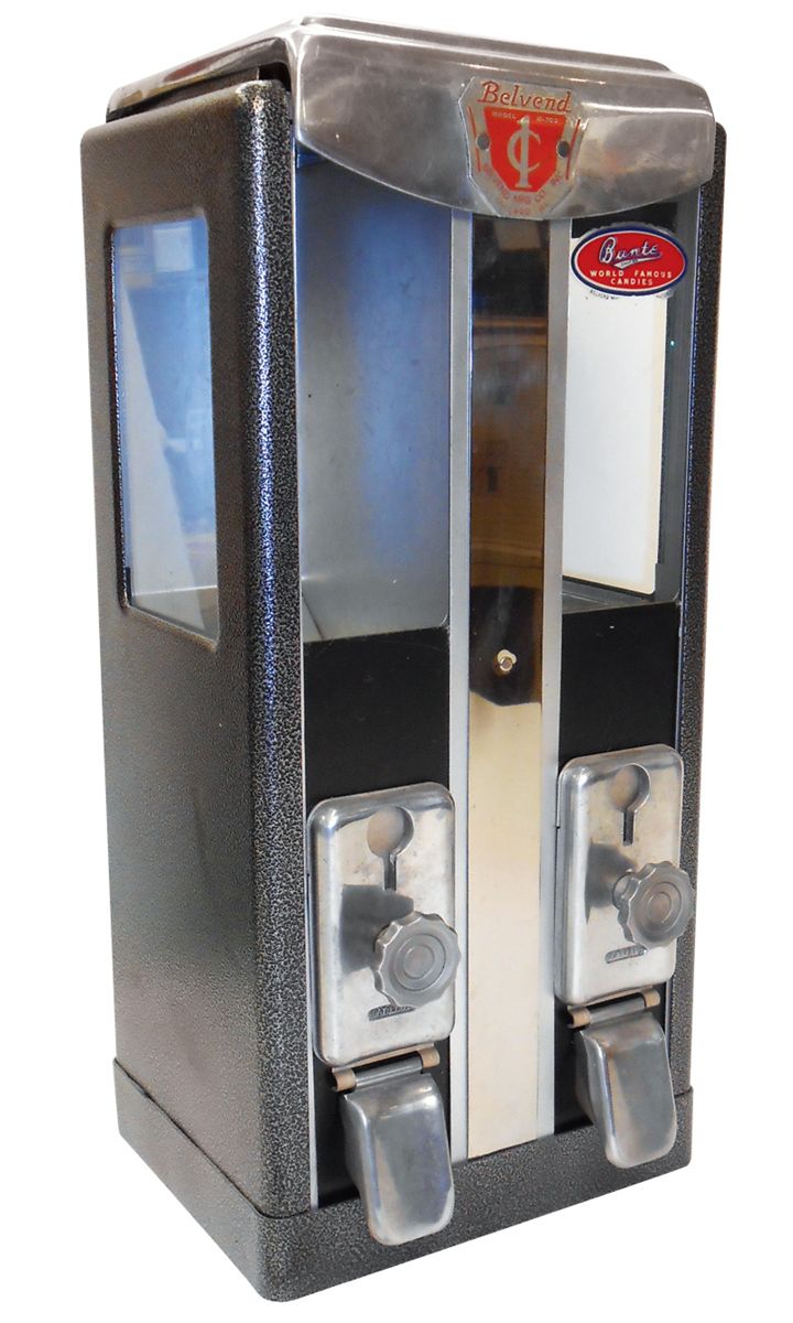 Coin-operated machine, Belvend 2-column vendor, 1 Cent w/decal for Bunte's World Famous Candy, mfgd by Belvend Mfg. Co.-Chicago, Exc cond w/key, 19"H x 8.5"W.