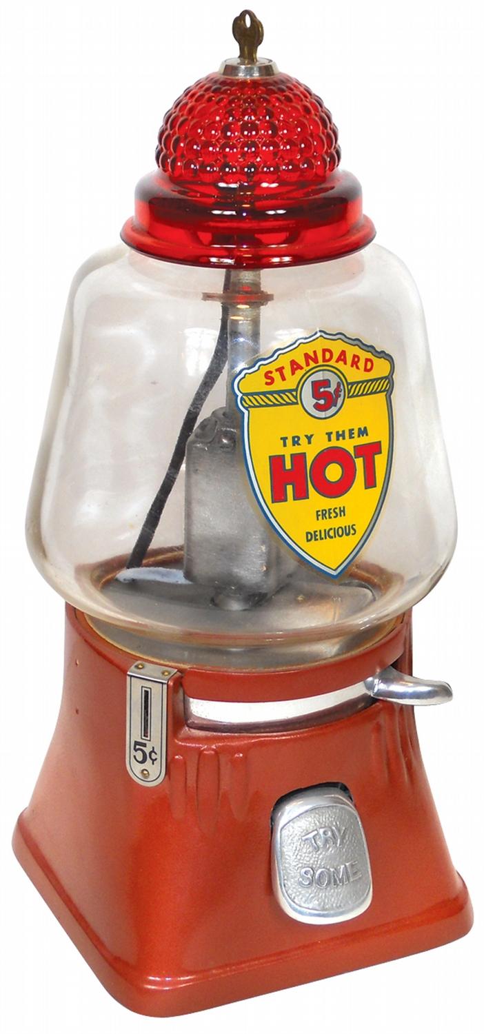 Coin-operated machine, Hot Nut, 5 Cent aluminum base w/ruby hobnail glass top that lights up, mfgd b