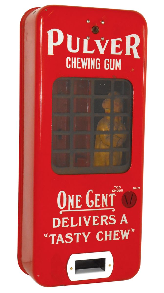 Coin-operated machine, Pulver Gum, red porcelain w/yellow kid figure, some in-painting on areas of porcelain loss, overall VG working cond, 20"H x 9"W.