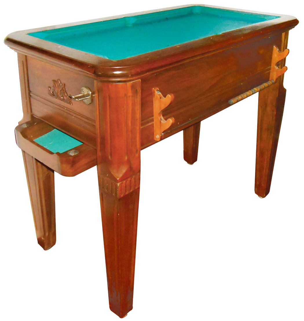 Coin-operated pool table, 5 Cent, walnut, scoring wire & cue racks on both sides, complete w/cues, balls & ball rack, Exc cond, 36"H x 24"W x 42"L.