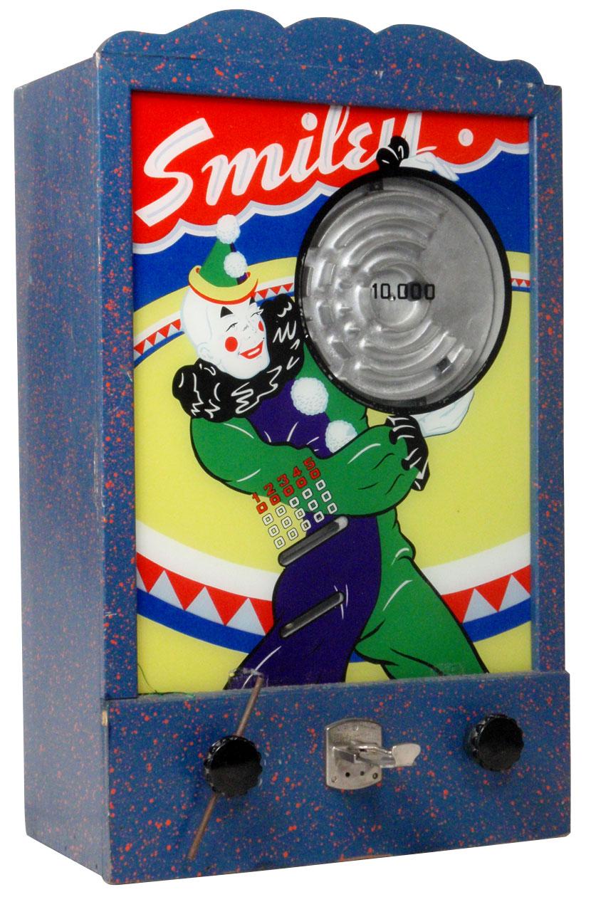 Coin-operated skill game, Smiley, 10 Cent, wood case w/glass face, patd 1933, VG cond, 25.5"H x 15.5"W.