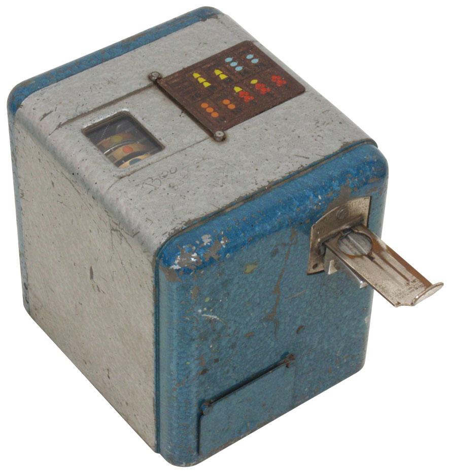Coin-operated slot machine, Mills Vest Pocket, c.1930's, orig blue & grey paint, not in working cond, 8"H x 7"W x 8"D.