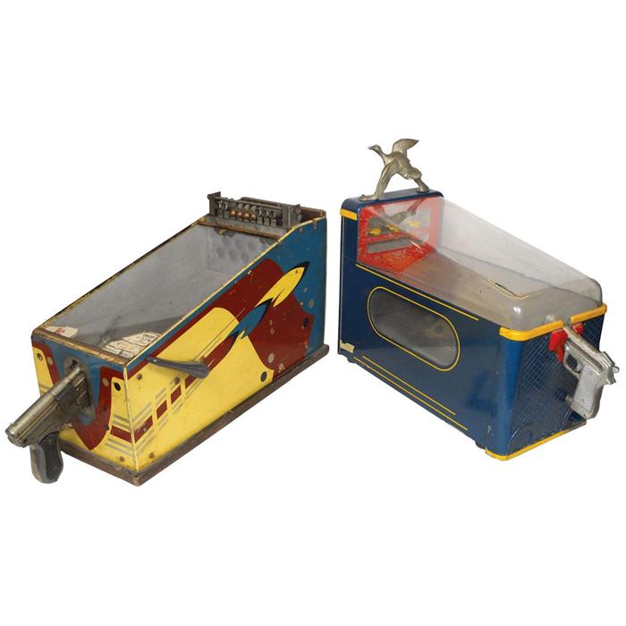 Coin-operated target games (2), A.B.T. Mfg, one in orig cond w/missing scoring head, other in Good orig working cond, c.1950-1960's, 19"H x 9"W x 24"L & 13" x 10"W x 28"L.