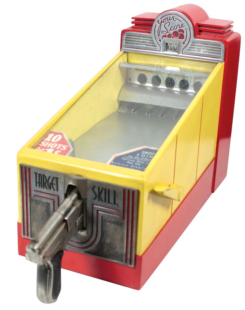 Coin-operated target skill game, 1 Cent, red & yellow, VG cond, no key, 16.5"H x 11"W x 27"L.