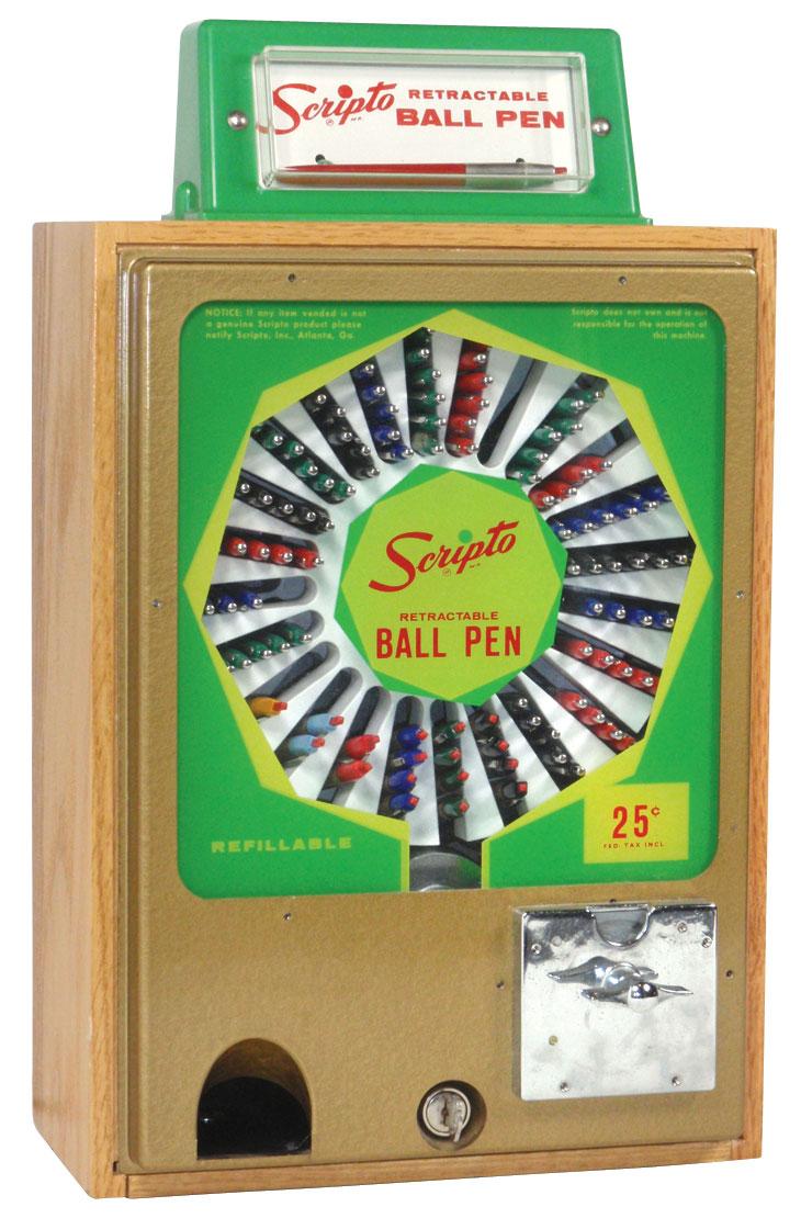 Coin-operated vendor, Scripto Ball Point Pen, 25 Cent, full of old pens, Exc cond, 21"H x 12"W.