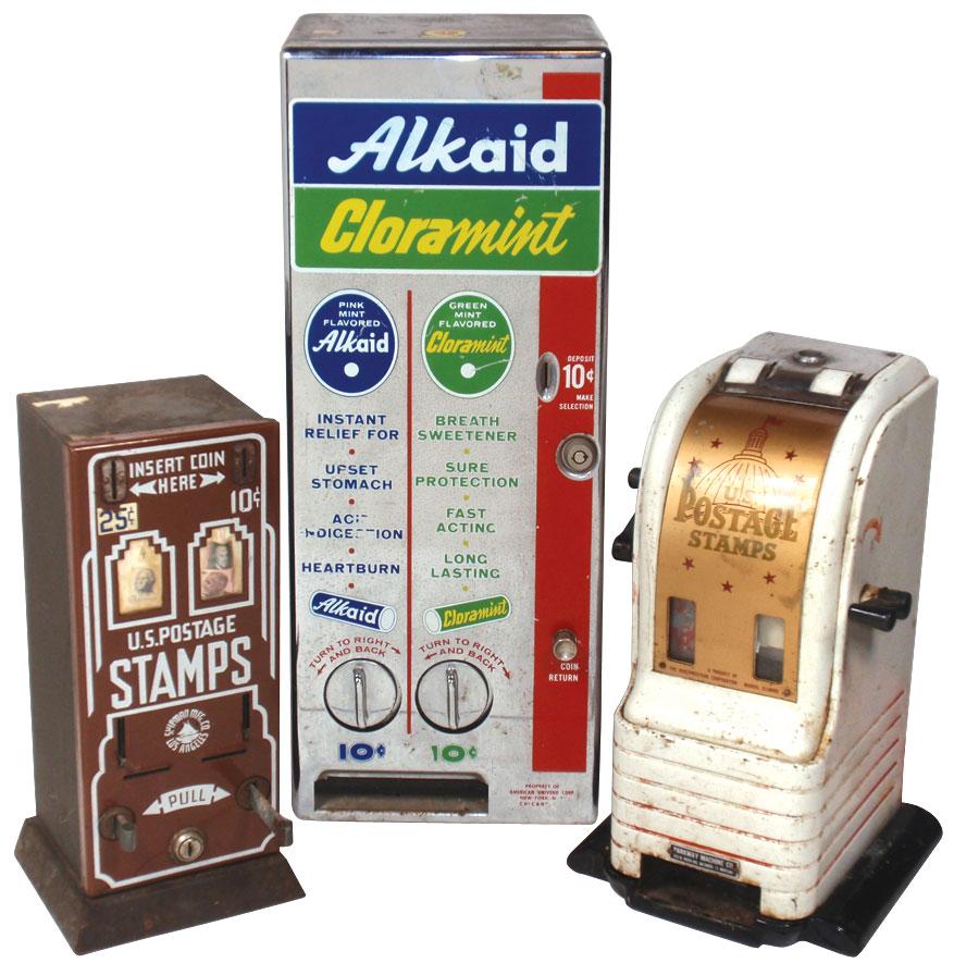 Coin-operated vendors (3), Jennings Alkaid Cloramint 10 Cent vendor, Shipman 10 & 25 Cent stamp machine & Parkway U.S. Postage Stamp vendor, all in Good cond.