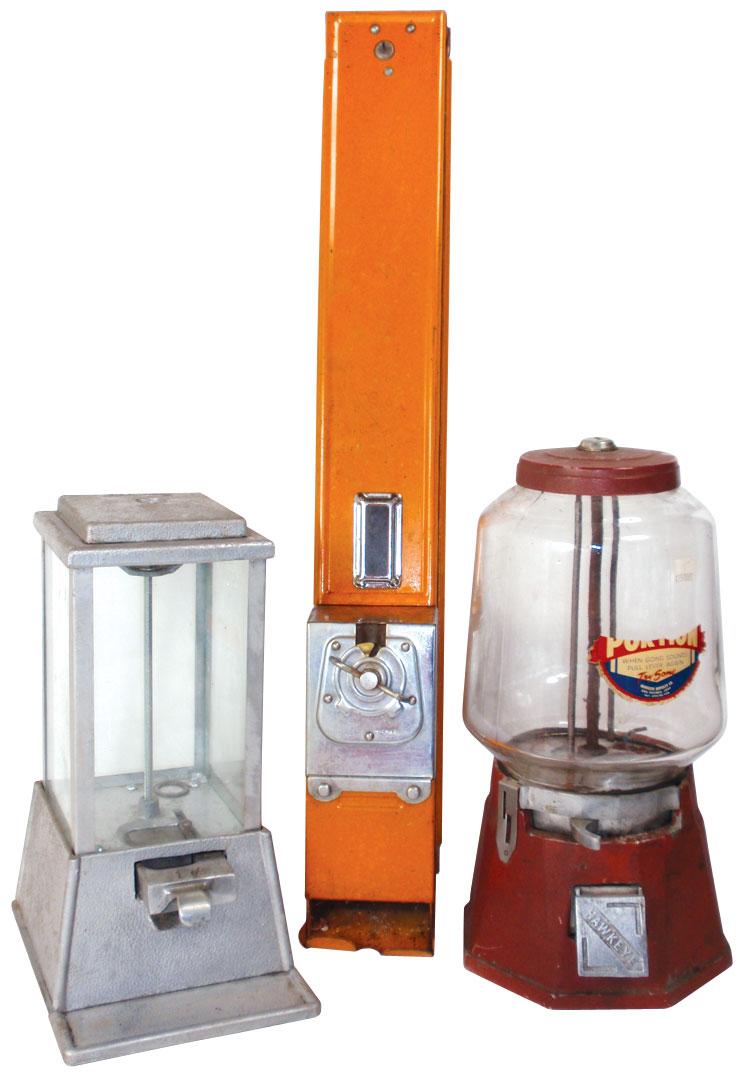 Coin-operated vendors (3), condom or candy vendor, c.1923, Hawkeye peanut vendor (jammed), & Star 1
