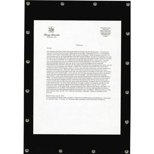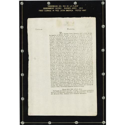 <B>Coinage Decree for First Coinage in Free Latin America-Potosi Mint,</B></I> an original copy of the coinage decree authorizing the Potosi Mint to produce gold and silver coinage. The decree is date July 28, 1813. The decree also describes in some detail the design of the gold and silver coins. This decree was issued in Buenos Aires by the Secretary of the Government Dr. Bernardo Velez and is in XF condition. A wonderful document on early Latin American coinage.<BR><I>From The Rio De La Plata Collection.</B></I>