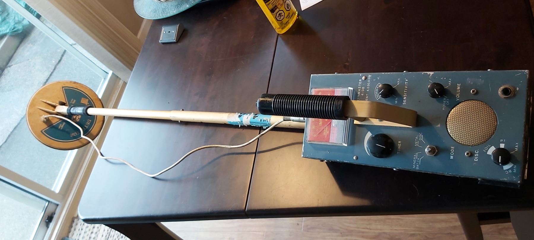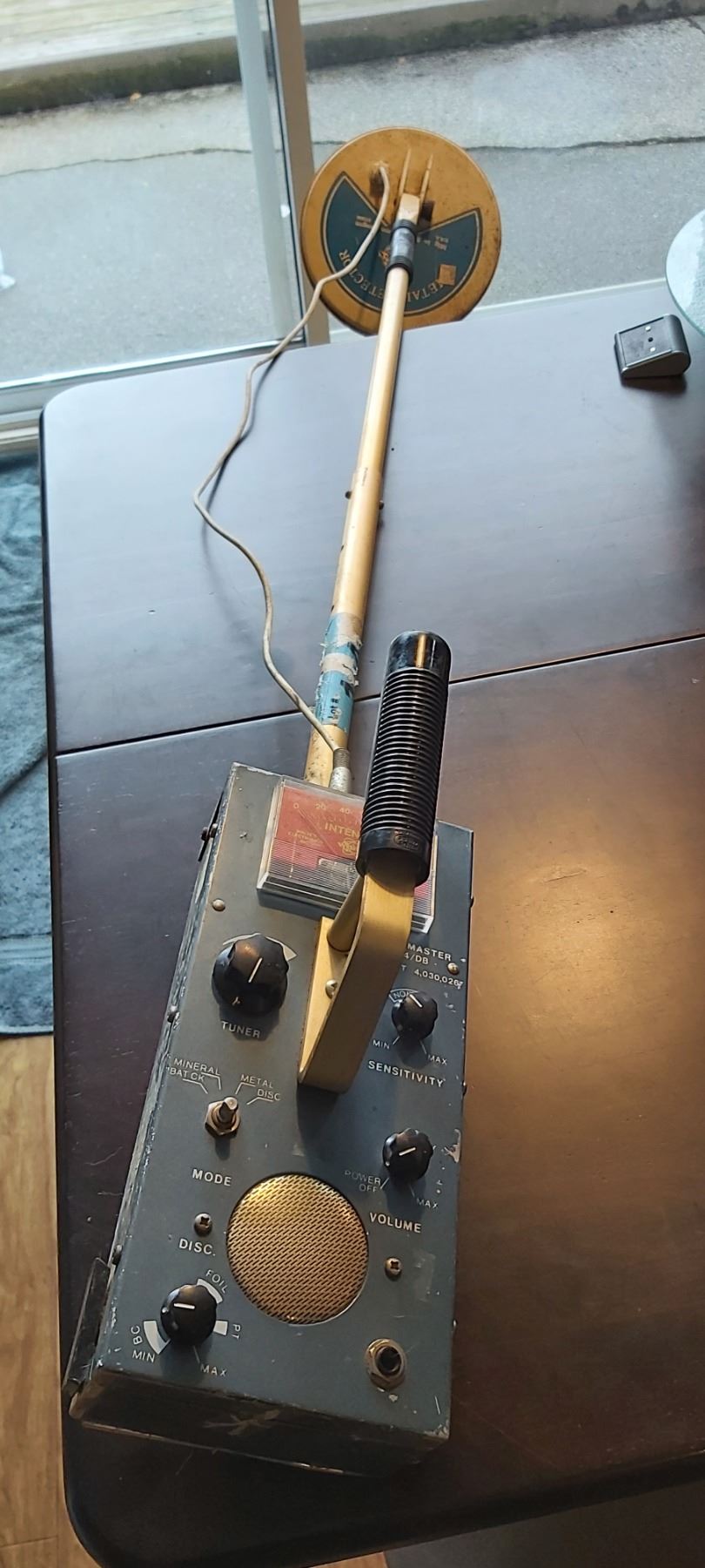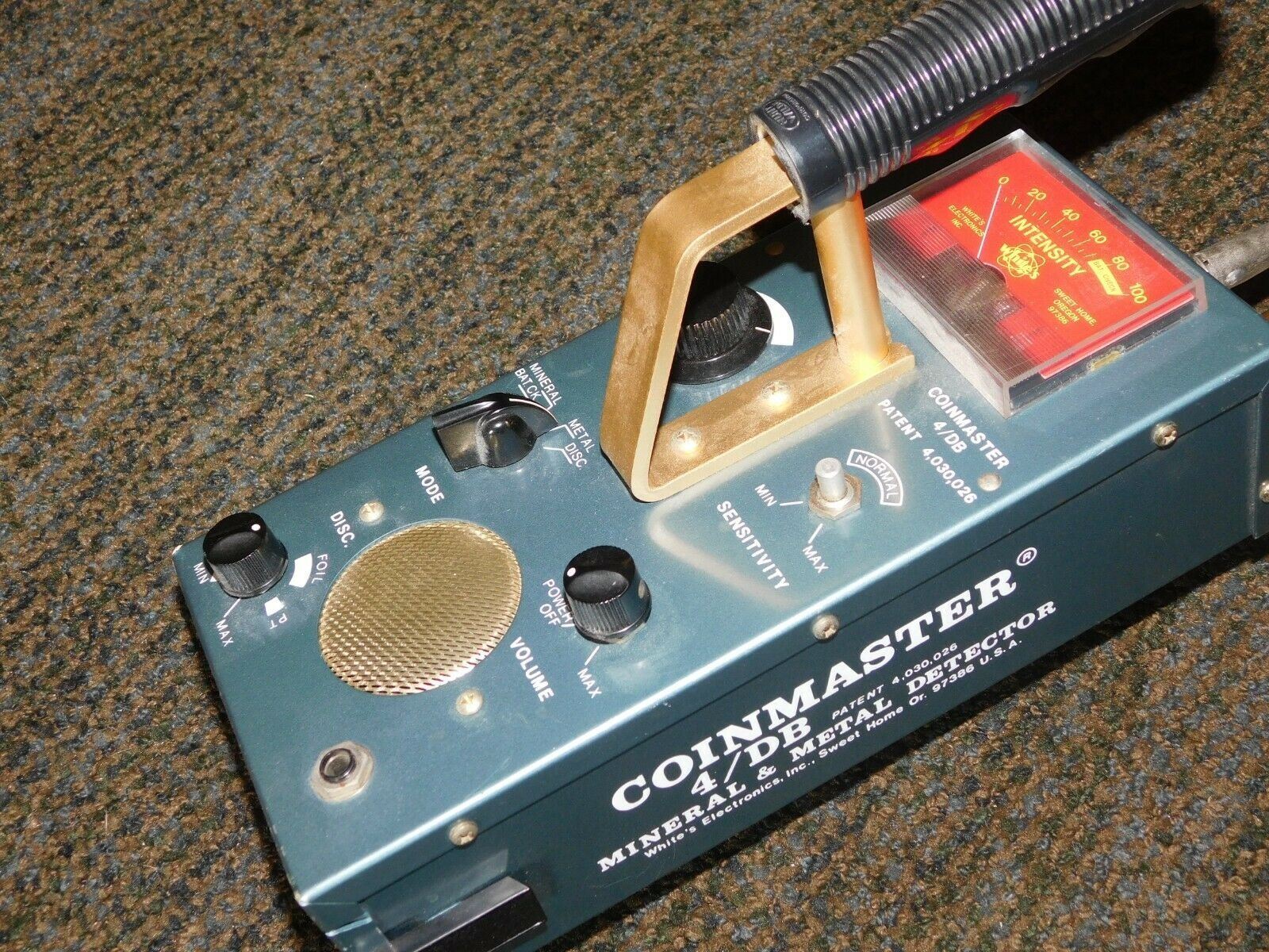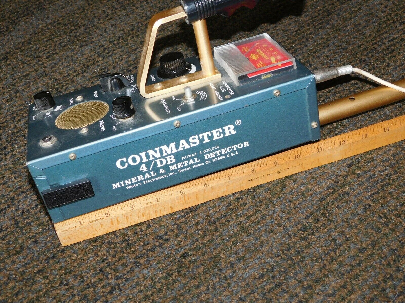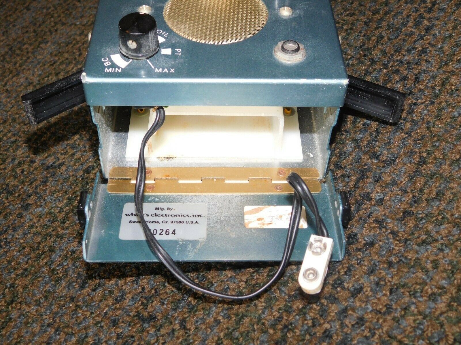 One of the original White's 4 D/B Mineral and Metal Detector. Has a 8" detector base & 40" long fully extended wand. This detector uses one 9 volt battery (Not included)