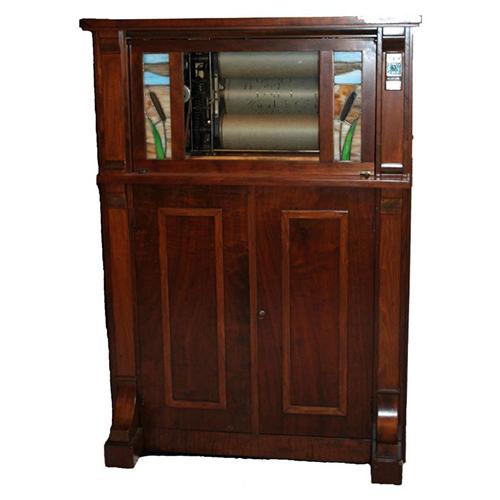 Coinola "Cupid" Nickelodeon, American, 1920's, paper roll player. Piano and mandolin. Veneered oak case with art glass front. 37 ½" W x 22" D x 55" H. Excellent.